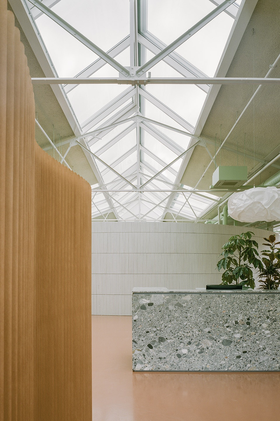 整个空间铺设了陶土色地砖,营造出温暖而统一的氛围,并在会议室中得以延续。我们保留并展示了所有的机电设施,并将其喷涂为对比鲜明的薄荷绿色。最具亮点的部分,是通往室内仙人掌花园的螺旋墙体,以及大部分家具——它们以柔和的白色和灰色调呈现,低调而优雅。