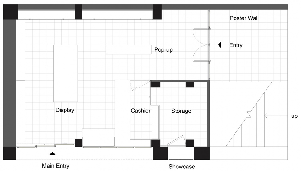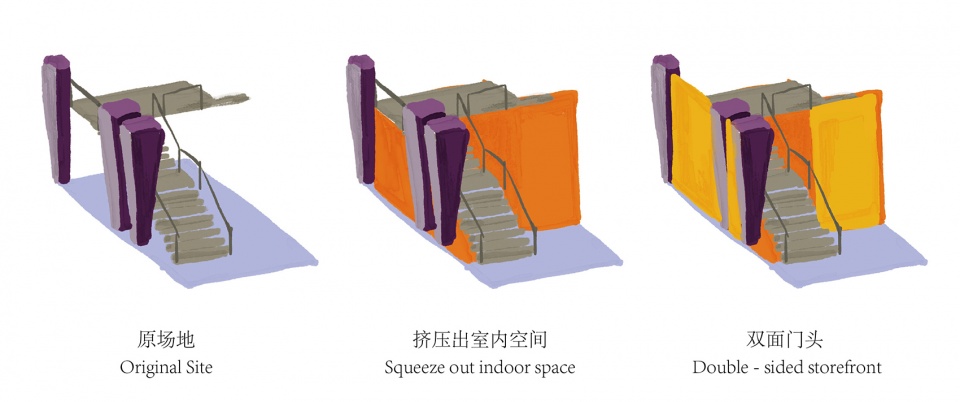 场地原本是这栋历史建筑临街的一个开敞楼梯间。准确来说,蜜多商店的使用空间是被夹在楼梯下方和几个 大柱子之间的缝隙里的,有面朝两条街道的双门头展面和被大楼梯挤压出层高急剧变化的室内空间。