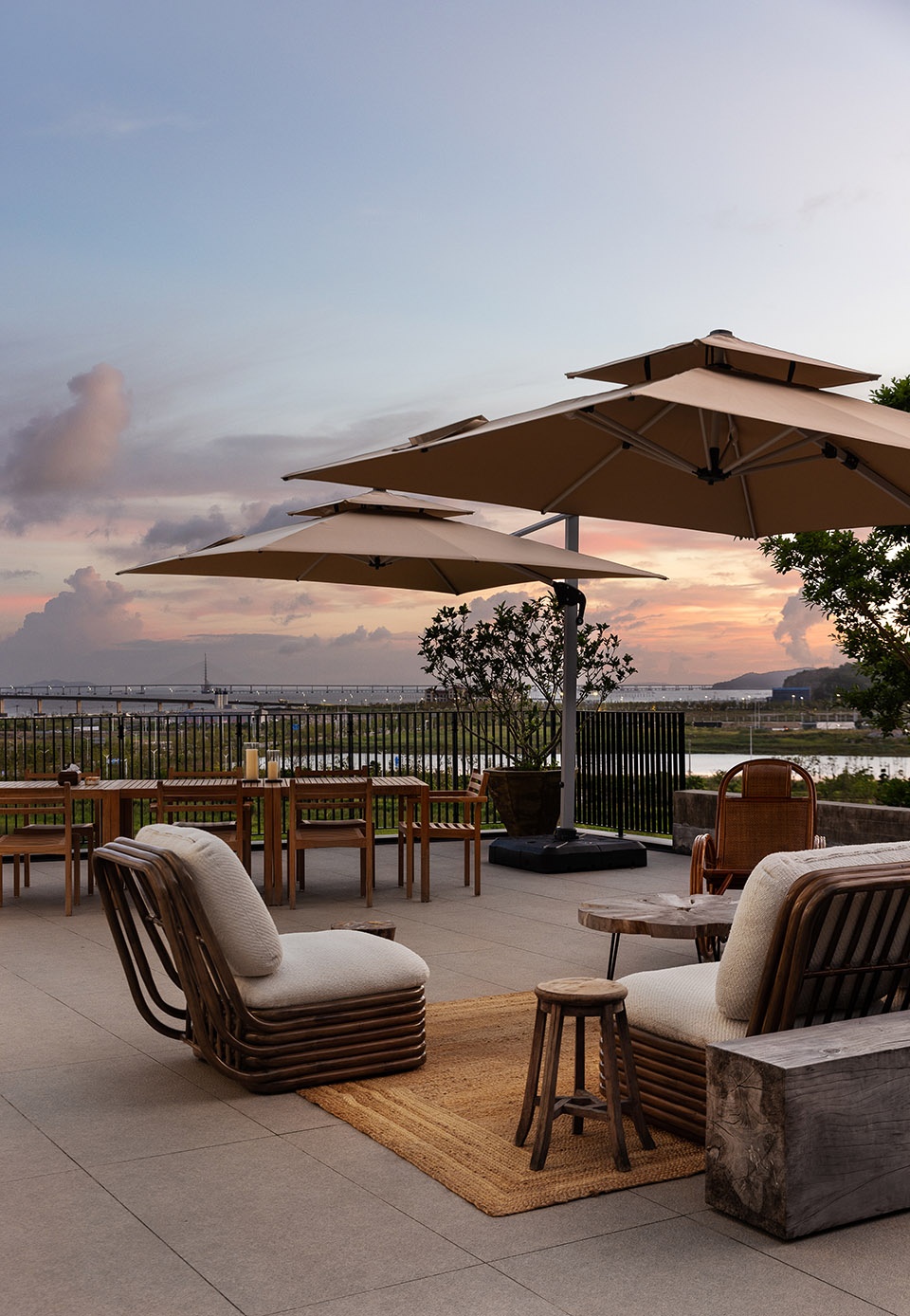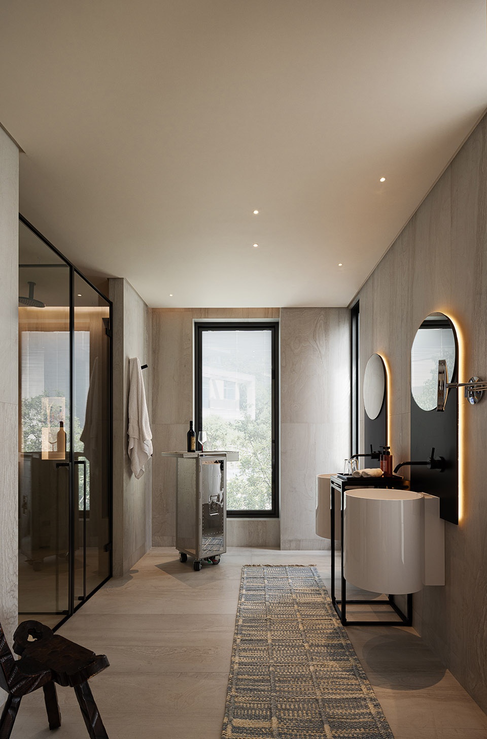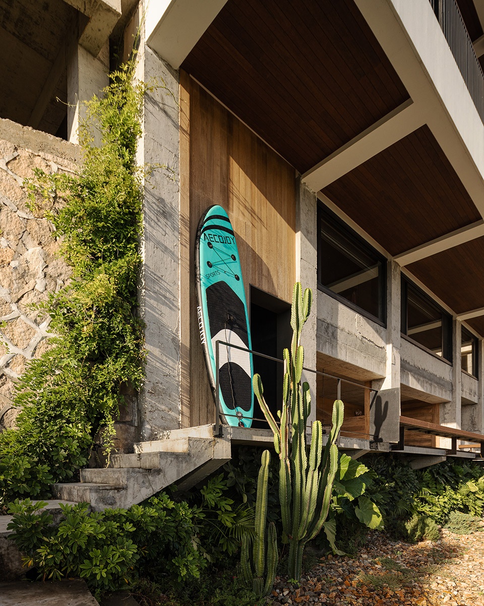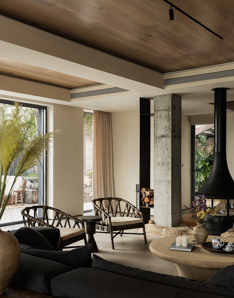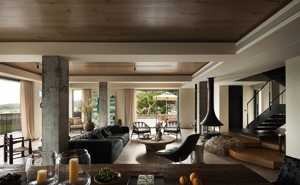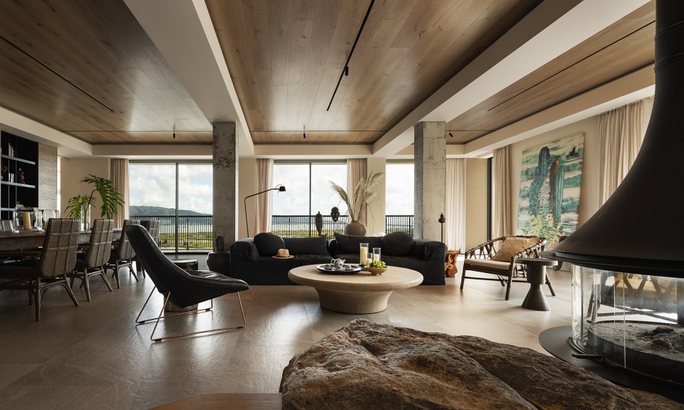 材质上,我大量运用大地米色系的岩石地砖、原木饰面,部分区域保留了水泥柱体的肌理。没有选择光亮华丽的材质,而是以哑光、粗朴、有自然质感的表面为主。它们不仅与户外的海、石、树木呼应,更在视觉与触觉上弱化了室内外的界限。当我们光脚踩在略有凹凸的石材地面上,或手指抚过一块老木头,那种来自自然的真实感,是任何抛光大理石无法替代的。