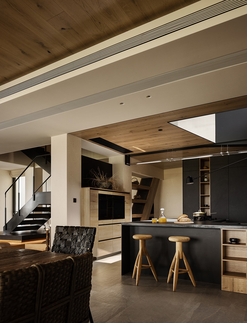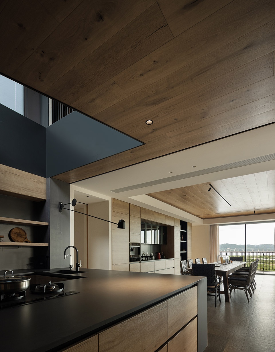 我选择了彻底开放的公共区域——厨房、餐厅与客厅之间没有实墙分隔,地面和天花板材质从自然中过渡而来,视觉上连成一片,打开分隔室内外的大玻璃门窗,便完全实现了与室外空间的连贯性,这种“无界”的处理,不仅让阳光与空气自由流动,也让我们在家的活动变得更加自在和松弛。