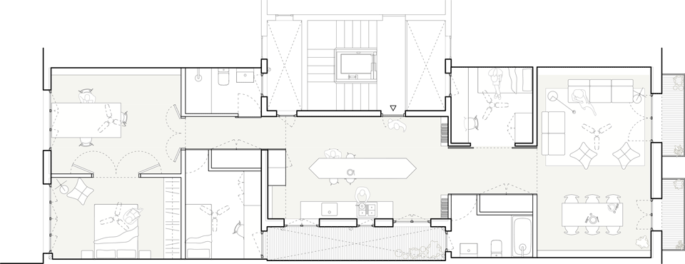 新的布局有着明确的目标:最大化两个立面之间的视觉与空间联系,增强自然采光与交叉通风。为此,公寓中央区域的所有非结构性隔墙都被拆除,创造出一个宽敞的过渡空间,作为两面朝向之间的缓冲区。