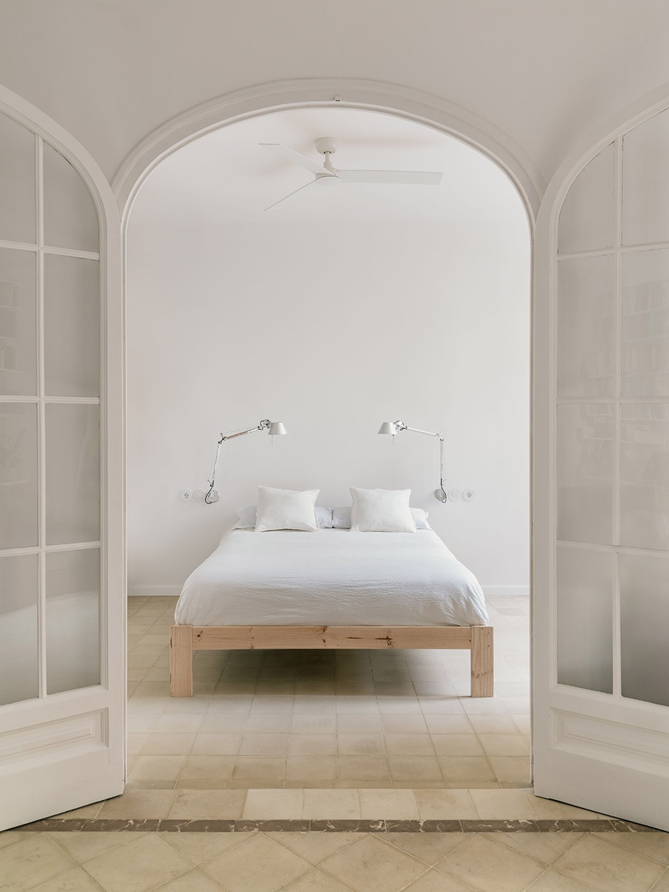 在厨房与公共区域(客厅面向Mallorca街,书房面向内院)之间,设计了几个“缓冲区”。这些过渡空间容纳了儿童卧室与两个浴室。在这些区域中,公寓原有的木门被精心修复与重新安置,形成了内部的“立面”,赋予流动空间深度与身份。