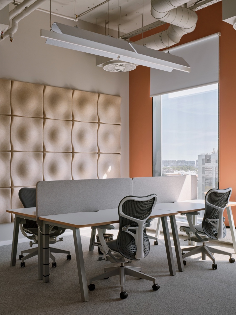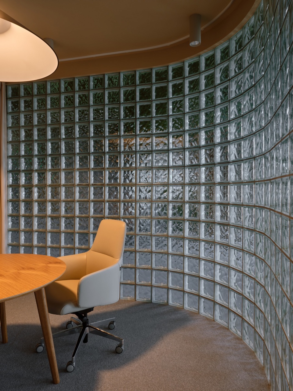 “We sought to strike a balance between the industrial memory of the place and a tactile sense of comfort, to create an office where people would want to spend more time in the era of remote work. The glass-block cube with informal meeting rooms, the coworking library, the gazebo-like coffee point, retro colors, and felt—this project is about caring for the individual, their daily rhythm, and their inner comfort within the workspace.” — Evgenia Bershtein, Project Designer