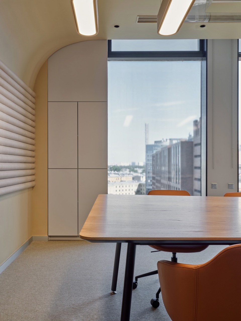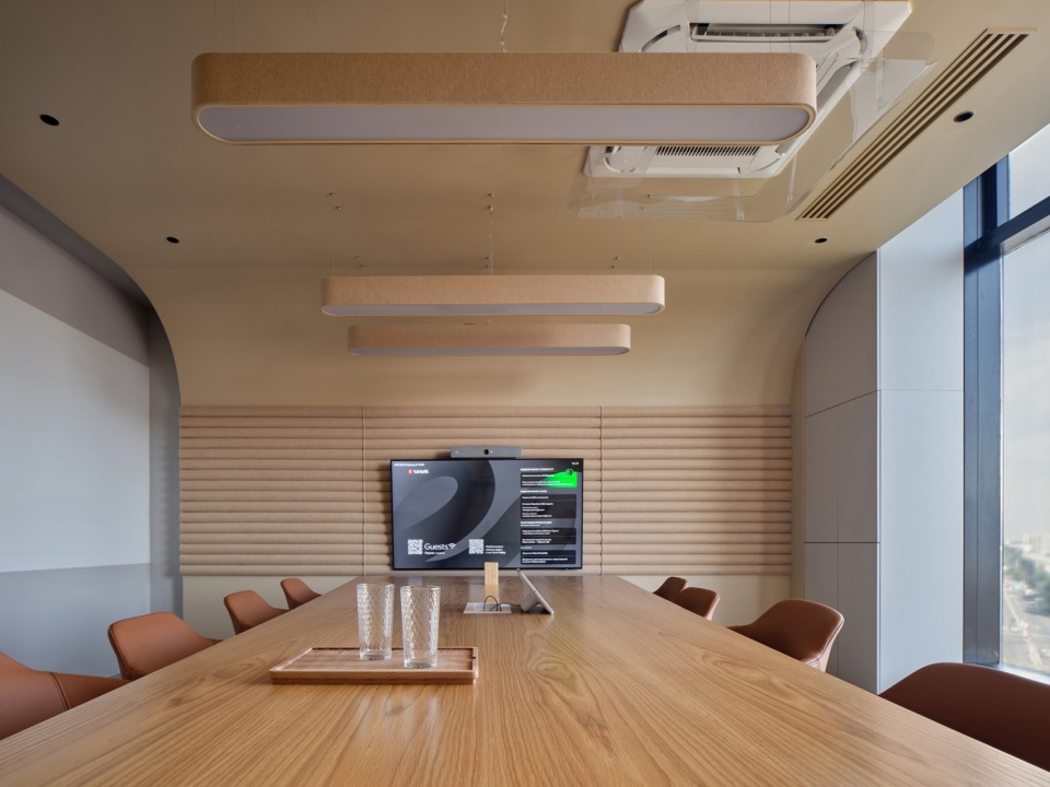 The coffee point resembles an open gazebo with cocoon chairs, zigzag sofas, and poufs. The meeting rooms are finished in an ochre-beige color palette with acoustic panels and textiles, creating a functional and calm atmosphere conducive to focused work. For moments of solitude, there is a hidden meditation room—a retreat space with a circular window, curtains, and pebbles—as well as individual phone booths.