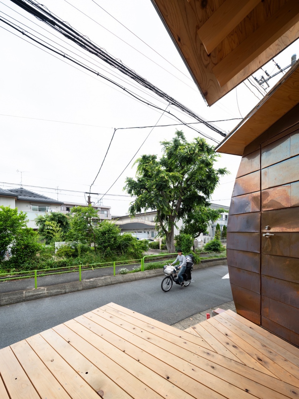 Located along a verdant pedestrian greenway in Nerima, Tokyo, this house engages directly with the everyday landscape of the neighborhood, where residents cultivate flowers and fruit trees and use the path as part of their daily walks. Rather than simply facing this linear environment, the project inserts a new spatial scene into it—one that invites interaction and gradually becomes part of the local ecology.