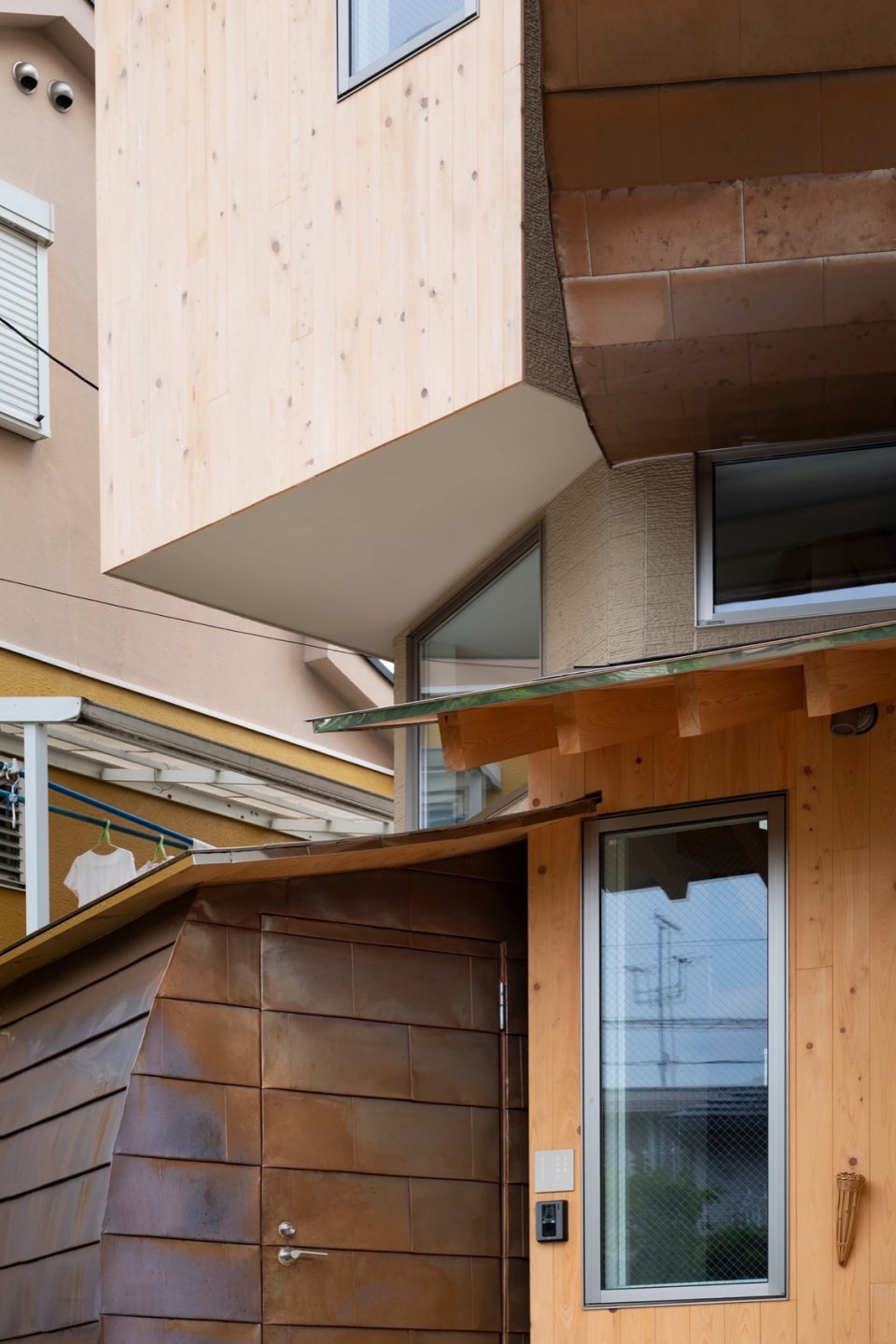 The façade responds to the mixed curvature and verticality of surrounding trees, combining planar and curved surfaces with materials that transform over time—copper and Japanese cypress. Copper panels are installed in a traditional ichimonji-buki pattern, while hinoki is used as vertical cladding with varying orientations. A stainless-steel curved roof unifies the form. The intention was not to impose a single dominant expression nor to create a visual collage, but to establish an appearance that opens outward—inviting imagination, ambiguity, and change.