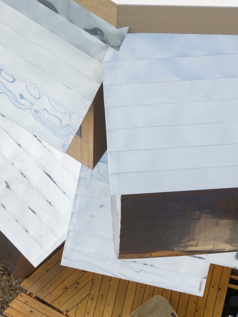 建筑外立面回应了周围树木的曲线和垂直性,结合了平面和弯曲的表面,采用随时间变化的材料——铜和日本柏木。铜板以传统的一文字葺式图案安装,而桧木则作为竖向外立面,采用不同的方向排列。一个不锈钢弯曲屋顶统一了整体造型。设计的意图并非强加单一主导的表现形式,也不是为了创造视觉拼贴,而是希望建立一个向外开放的外观——邀请想象、模糊性与变化。
