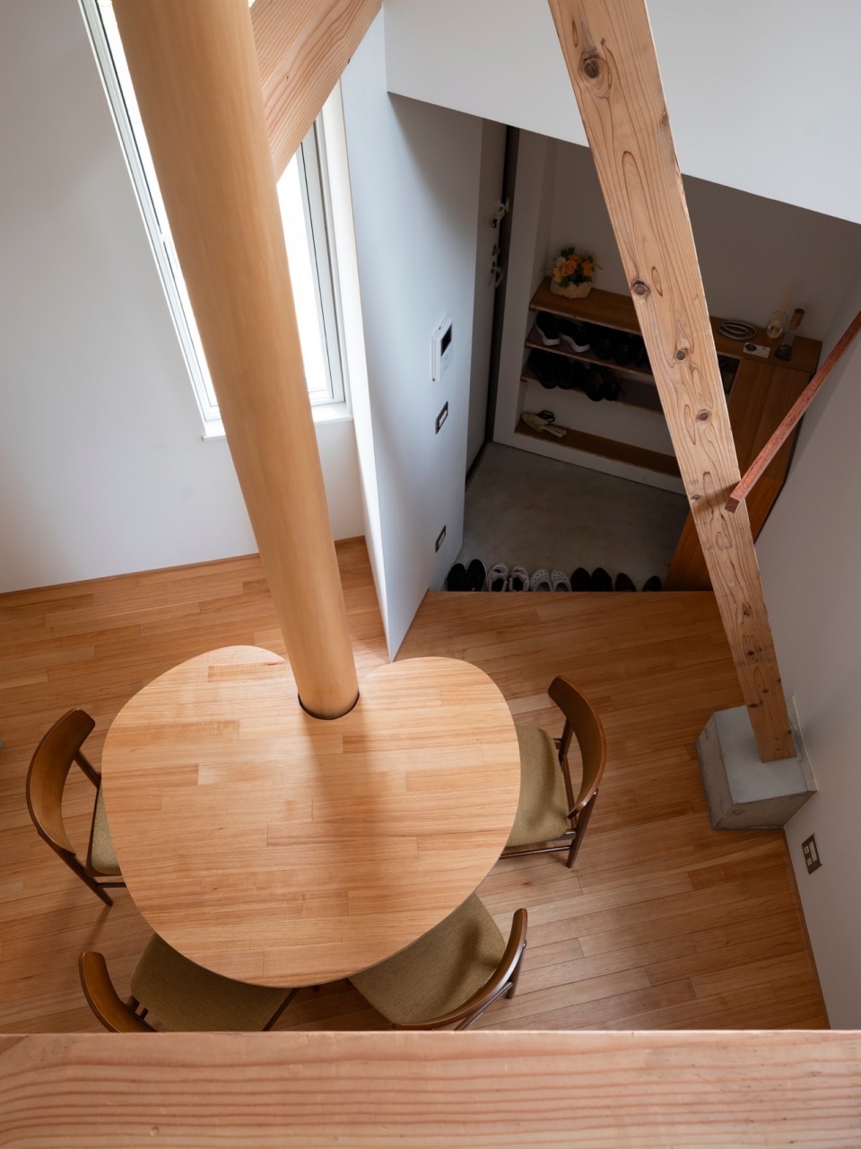 On the first floor, the sculptural façade is expressed internally as a round timber column, around which a custom table was built. This dining area is illuminated from above by a north-facing clerestory window opening toward the greenway, creating a calm communal space filled with soft natural light.