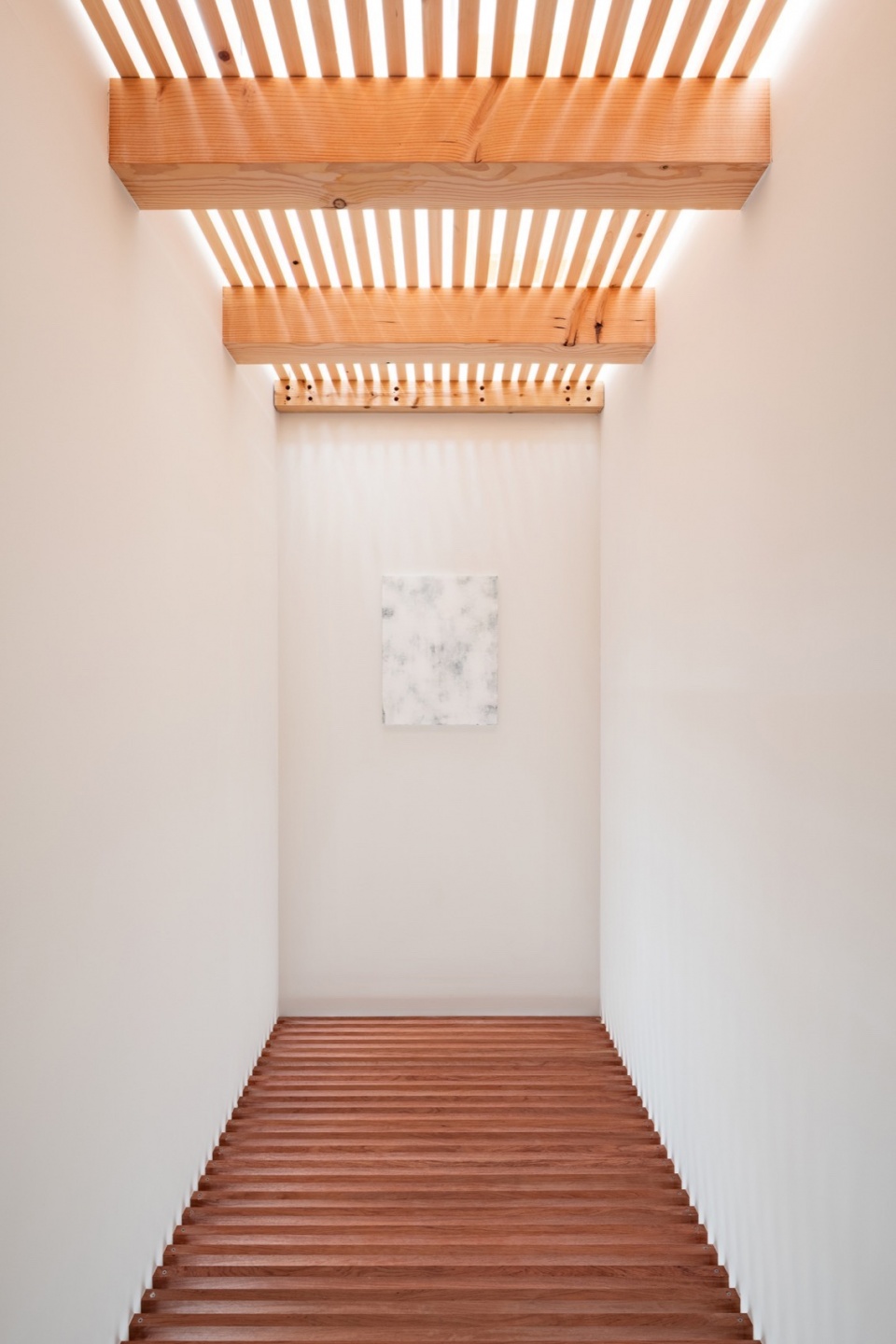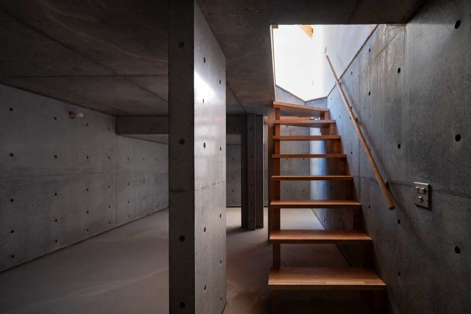 A tower-like vertical void on the south side brings daylight through slatted floors to every level of the house. Light enters from openings at various heights and directions, reflecting off white surfaces to create a soft, atmospheric glow. This shifting quality of light—changing with the season, time of day, and weather—produces an interior that is alive with subtle variations, offering a living environment that is both intimate and expansive.
