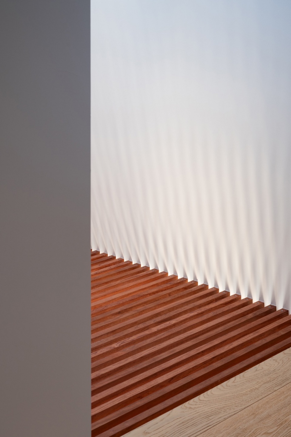 南侧的塔楼状垂直空隙将日光通过有缝隙的楼板引入住宅的每一层。光线从不同高度和方向的开口进入,反射在白色表面上,创造出柔和的氛围光。这种光线的变化特性——随着季节、时间和天气的不同而变化——使得室内空间充满了细腻的变化,提供了一个既亲密又广阔的生活环境。