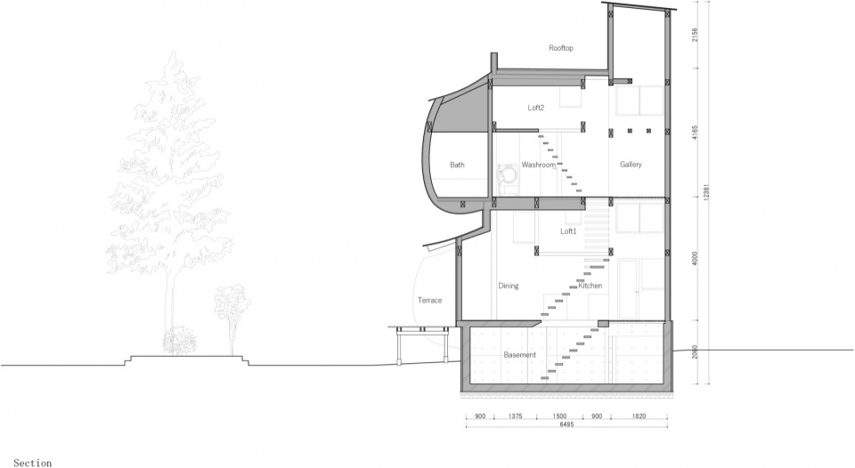 尽管场地仅有49平方米,合法的街道宽度为12米,提供了充足的垂直空间。室内被构思为一个垂直的单间空间,由重叠的楼板和交织的壁龛组成,创造出一个连续的三维居住环境。