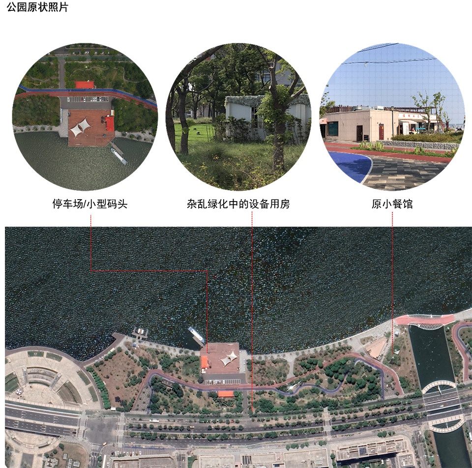 城市更新的前提在于对场地现状的深入观察与思考。当设计师以使用者的视角对场地的状态做了充分的调研:项目基地的原状只有流动摊贩、简易餐馆、小型停车场和废弃码头,缺乏必要的配套建筑;场地内的健身步道缺乏清晰的可达性,周围绿化杂乱,配电间与管线设施散落在灌木丛里,也让人缺乏游览的兴趣。当设计师走出场地来到街道对面,高起的土坡和密集的树丛隔绝了从道路看向滴水湖的视线,泛着波光的美丽湖面也未能展现在行人的面前。
