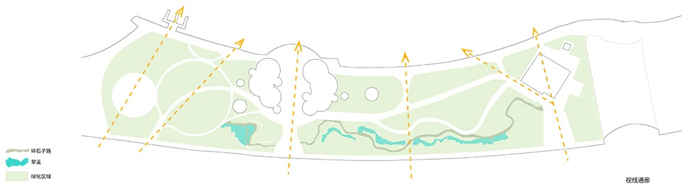 以上种种不足都掩盖了这片城市公园巨大的潜力与魅力,而对应的解决策略也需要是多层次的。设计师从路径、功能、空间和视线四个方面,回应游人行走、停留、使用和观望的行为需求。在这里,景观对于建筑不再是从属或相对独立的关系,而是有机组织、相互影响的综合性设计手段。