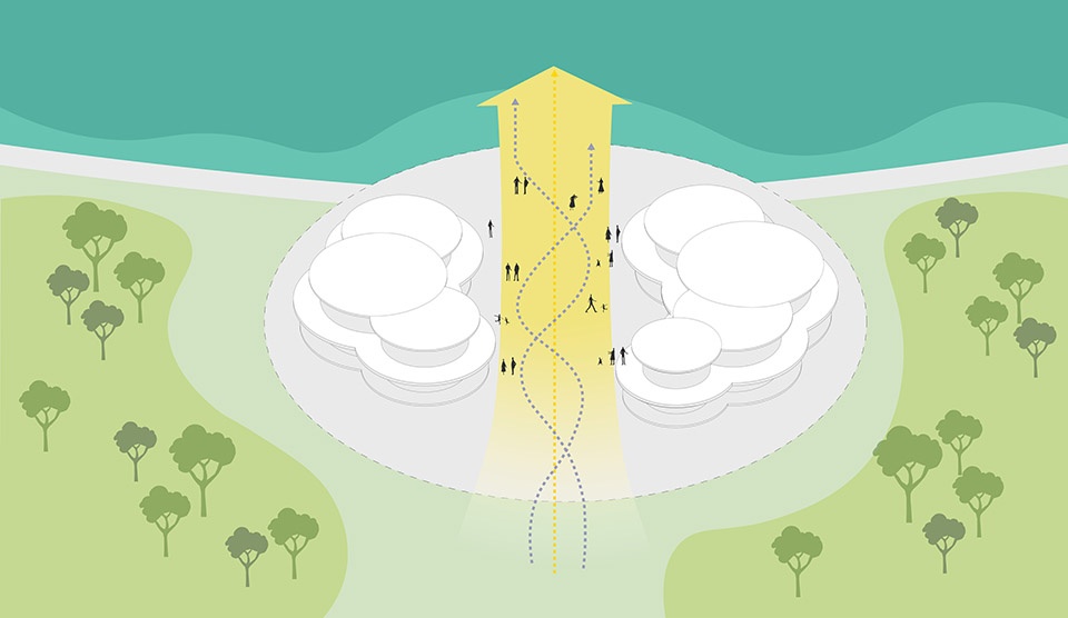 建筑师希望将湖景充分向城市空间渗透:当人们开车从临港新区的主干线环湖西一路经过时,可以通过车窗眺望映射着阳光的湖面。通过两侧对称布置的建筑和公园入口,限定中心的临湖广场,将人们的视线引导到湖面。波光粼粼的滴水湖不仅是人们视线的焦点,也是各种滨水活动的开阔背景:漫步,休憩,舞蹈、庆典,当周末的烟花在天空点亮,这里也是绝佳的观赏平台。