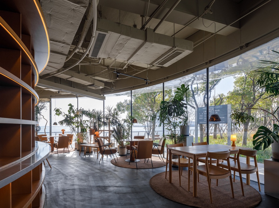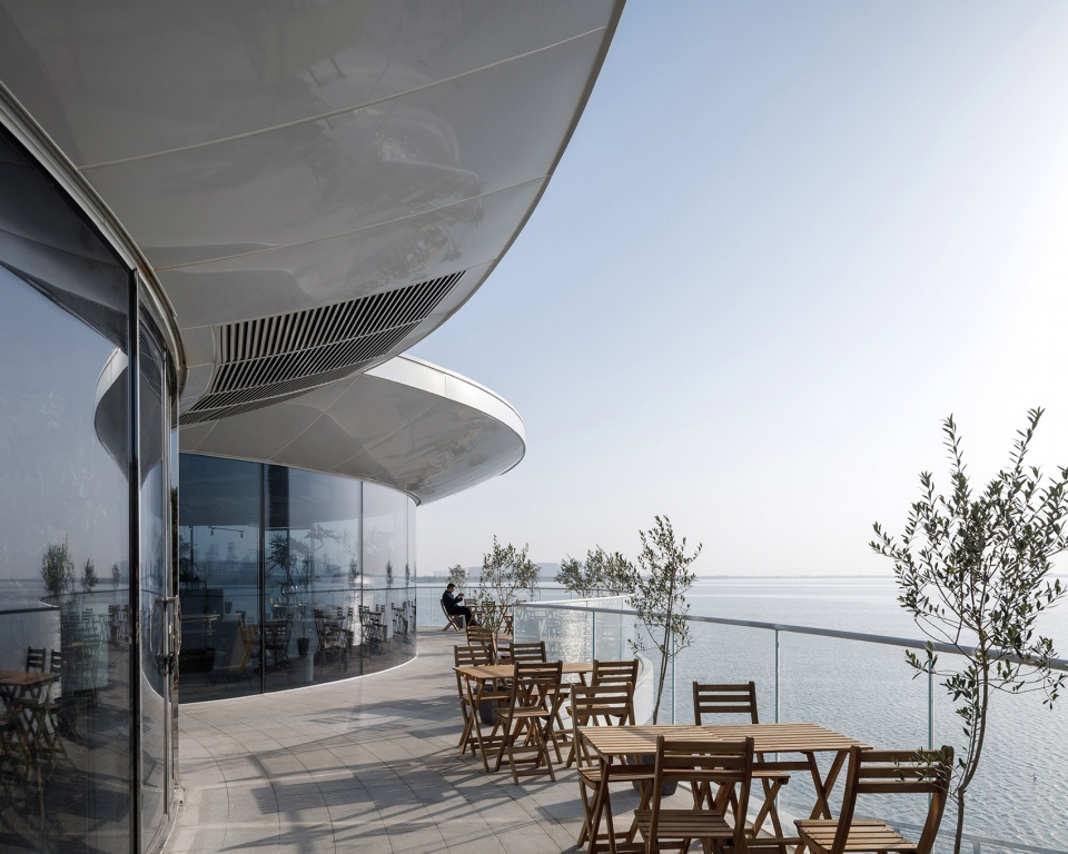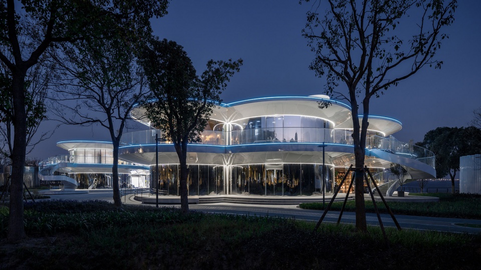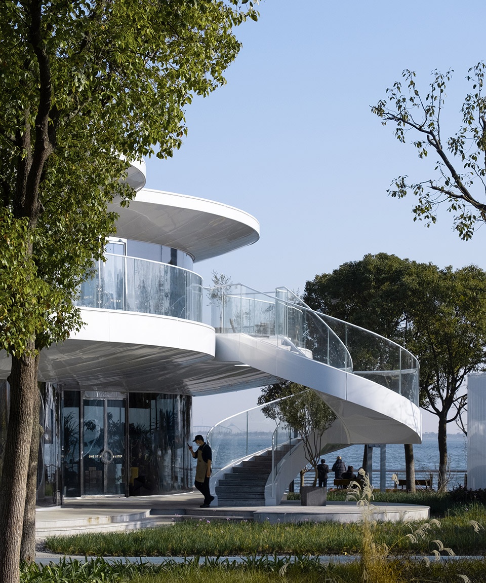The architectural design embodies a deep responsiveness to landscape and nature. Functioning as a café and light dining venue, the building features a curved, fully glazed façade that ensures an uninterrupted visual connection to the surroundings. On the ground floor, the urban-facing side is clad in mirror-finished stainless steel for auxiliary spaces, reflecting the lush parkland and allowing the structure to merge transparently and lightly into the natural setting. The lakeside portion of the ground floor and the entire upper level are enclosed in unobstructed glass curtain walls, offering views of the serene, expansive lake and the vibrant public activities on the plaza. Here, the boundary between interior and exterior blurs—the lake scenery and plaza life become part of the architectural experience, together creating a rich and open spatial atmosphere.