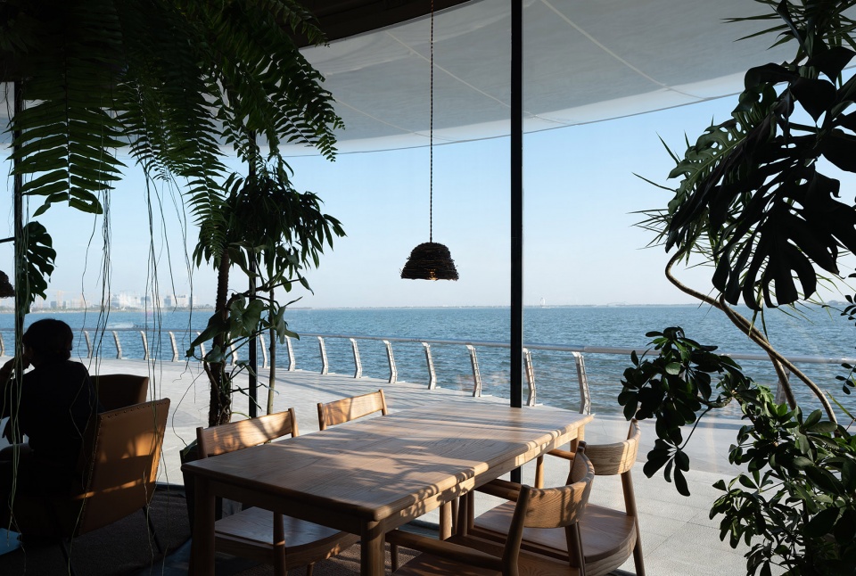 建筑设计秉承着对景观和自然的最大回应。建筑的功能为咖啡轻食餐厅,圆弧形的全玻璃幕墙保证景观面的连续开阔。一层靠近城市的部分以镜面不锈钢作为辅助用房立面,反射周边绿树成荫的公园景观,以透明轻盈的姿态融入自然。一层面向湖面及二层为毫无遮挡的全玻璃幕墙,从室内向外望,可以看到平静而广阔的湖面,和广场上丰富的公共活动。此时,室内与室外的界限变得模糊,湖景与广场的活动被纳入建筑空间,共同创造一种丰富开放的空间氛围。