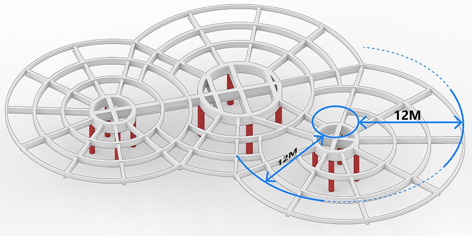 The structural design also serves the architectural vision. To preserve unobstructed views, columns are concentrated at the center of the circular plan, while tapered beams radiate outward from the core. By optimizing the load distribution of the cantilevered beams, a remarkable 12-meter cantilever is achieved. This arrangement effectively reduces the load on the peripheral structure, ensuring both lightness and stability. Ancillary facilities such as pipe shafts and restrooms are arranged in a circular layout around the central columns. Mechanical and electrical conduits are concealed within beam voids, and ventilation louvers are discreetly placed beneath the overhanging eaves. This allows interior and exterior ceiling lines to align seamlessly, enhancing the spatial coherence. By consolidating structural and mechanical elements within the central support unit, the cantilevered beams extend like umbrella ribs, creating a flexible, column-free interior and offering 360° clear panoramic views.