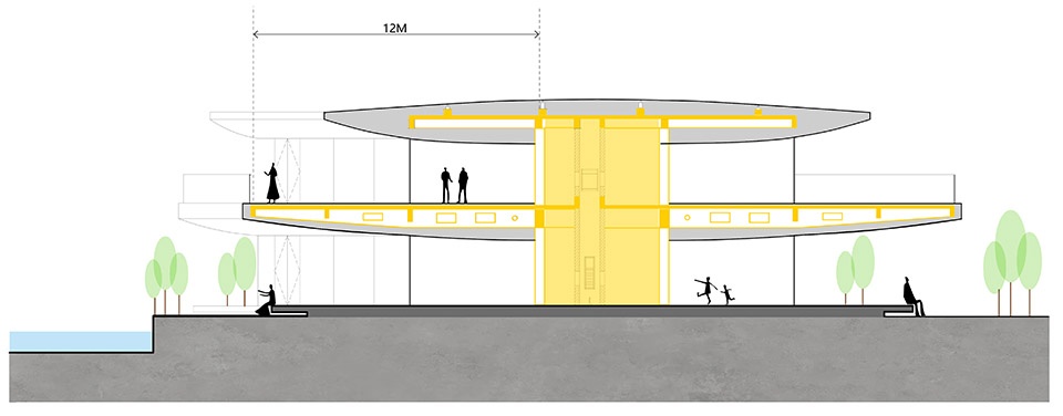云朵建筑(建筑A)位于原小型码头处,基于整体滴水湖的规划,后续这里不再设置游湖码头,而是完全开放给市民使用。这里位于地块的中心位置,面向滴水湖心,旧码头的驳岸凸出滴水湖的湖岸线,具有非常开阔的面湖景观。