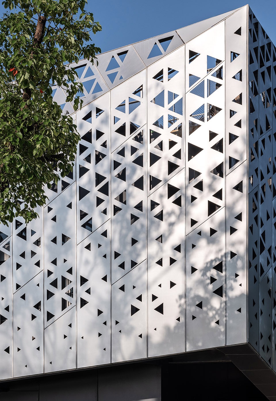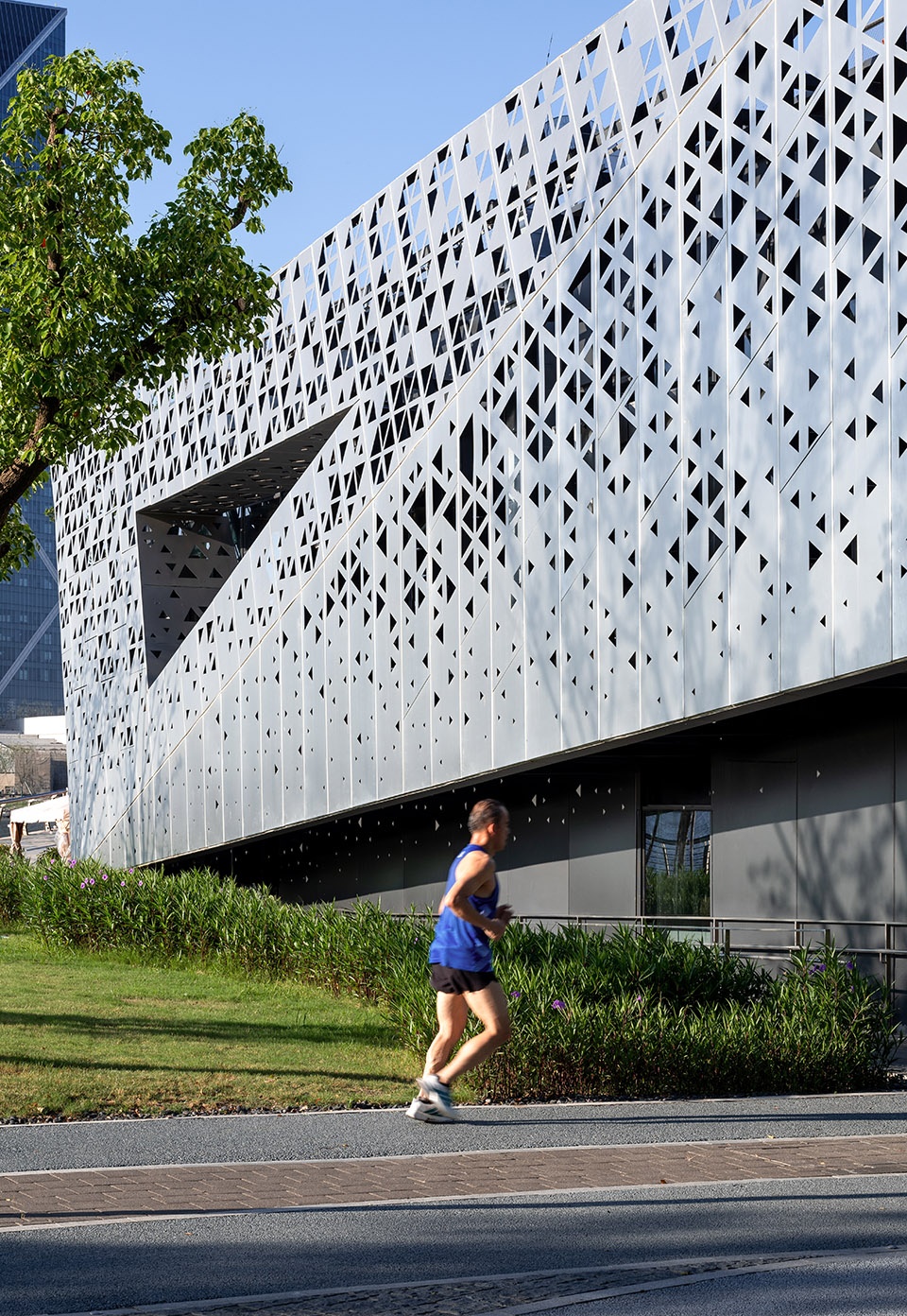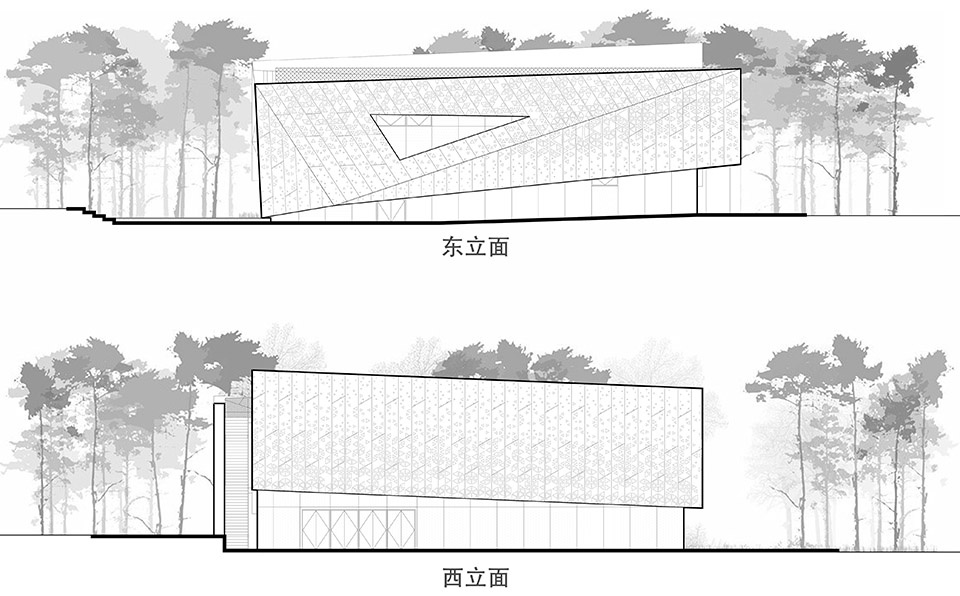 The façade design continues this interplay between architecture and environment. Matte brushed stainless steel panels reflect the surrounding vegetation and sky with low reflectivity and a muted texture, allowing the building to recede into nature while maintaining presence through its material uniqueness. The façade system consists of modular perforated panels, with varying aperture densities responding to interior lighting and viewing needs. By day, the façade appears as a light and ever-changing surface; by night, interior lighting filters through the perforations, transforming the building into a luminous vessel that becomes a visual focal point in the lakeside park—achieving distinct daytime and nocturnal expressions.