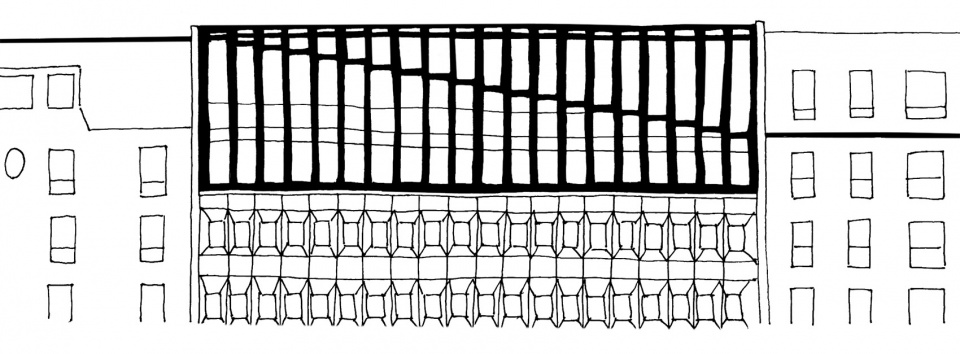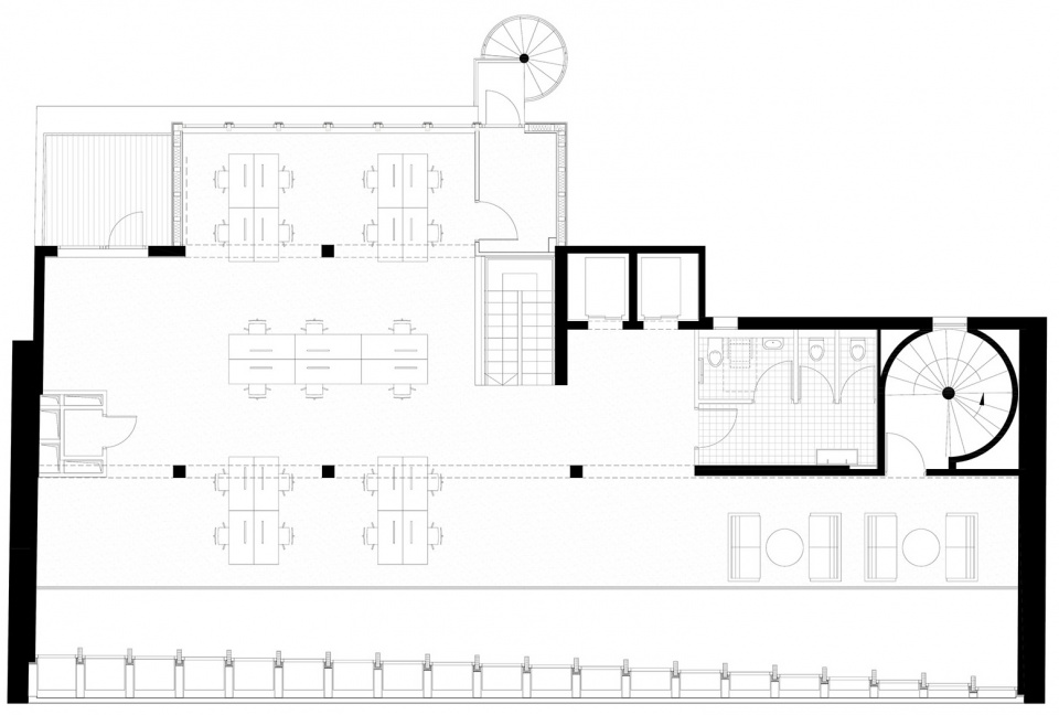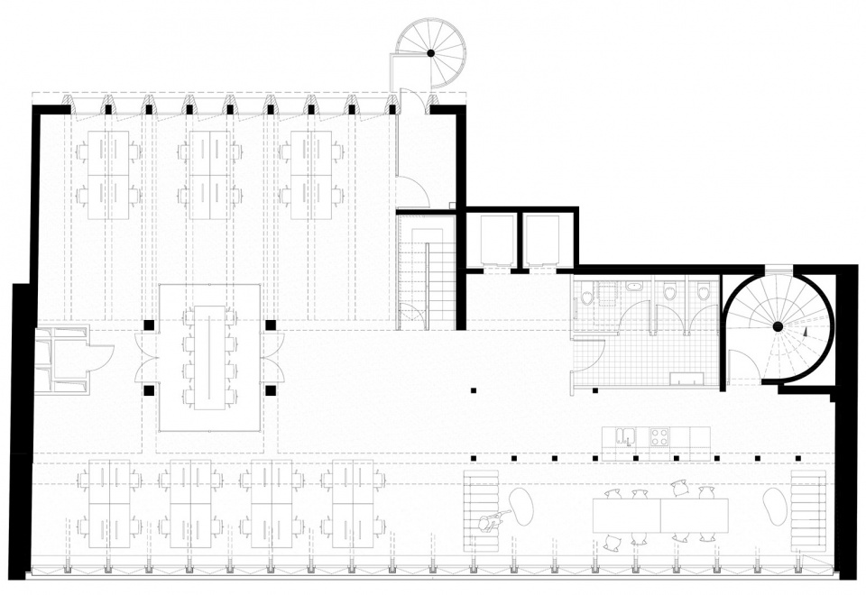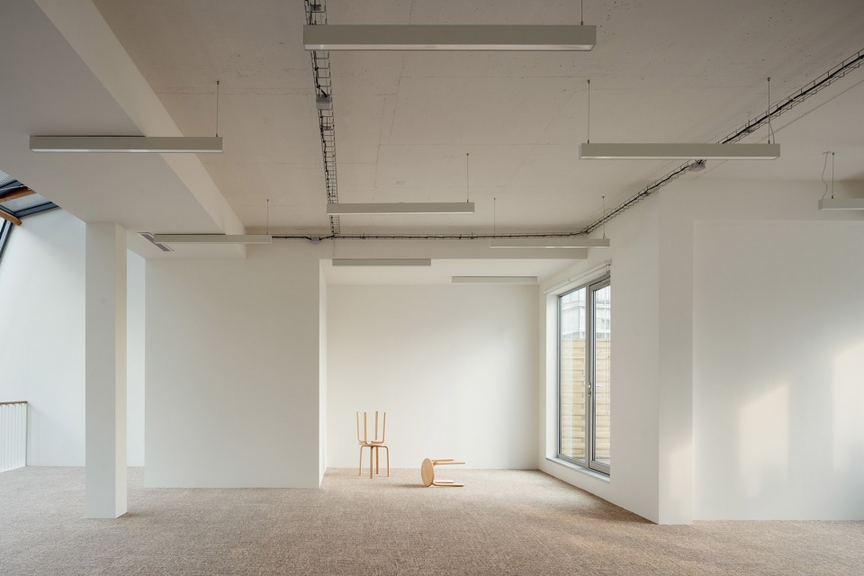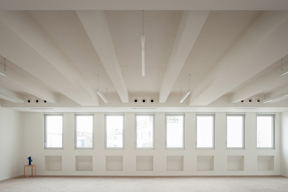之前露台的封闭需要拆除原立面上部的墙体,以为首个办公空间腾出空间,并在悬挑的夹层楼上增设第二层。在上半部分带有丝网印刷的玻璃屋顶下,两个办公楼层与街对面的住宅单位形成了对话关系,保持了因距离而不显突兀的和谐。