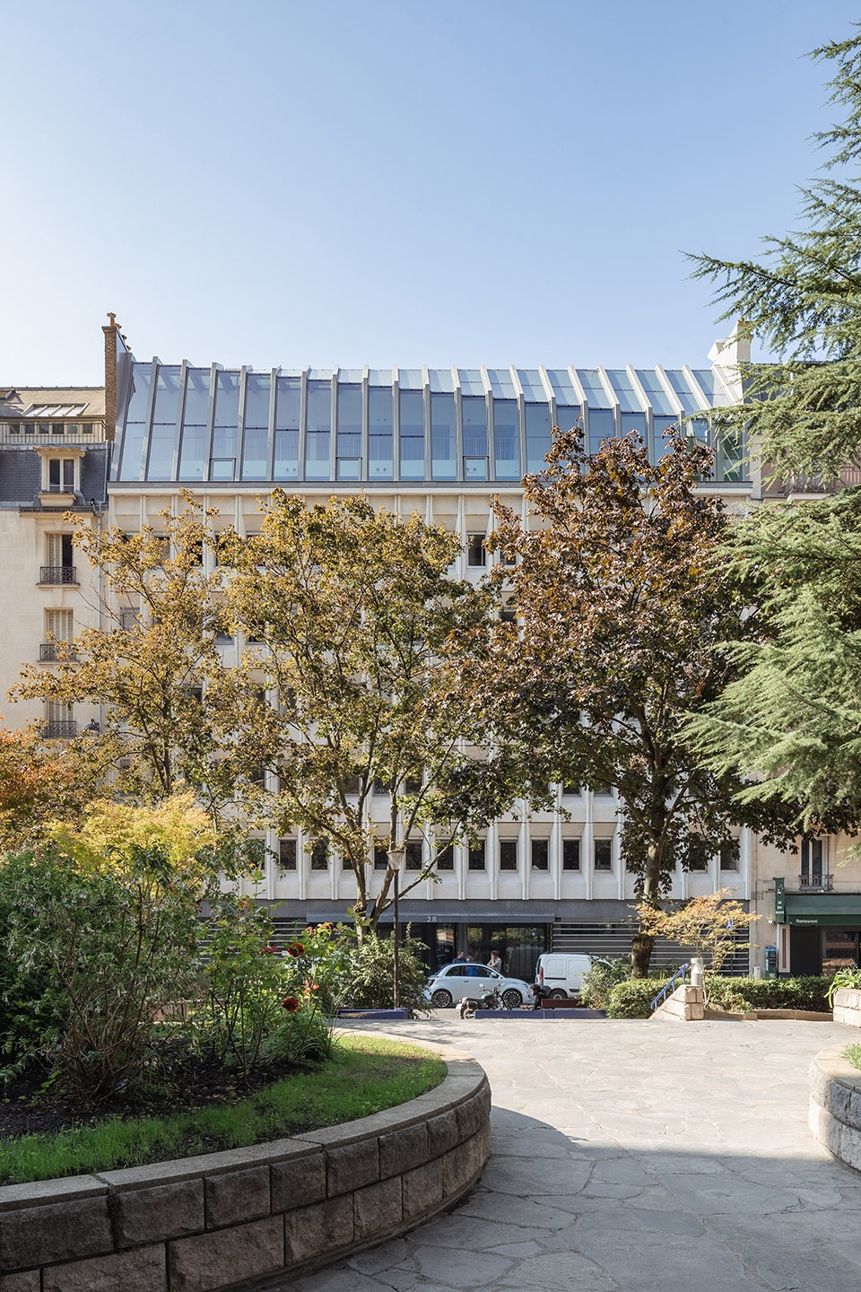 The closure of the previous terraces requires the dismantling of the former facade’s upper wall, in order to provide room for the first office space and to insert a second level on a cantilevered mezzanine floor. Under the glass roof, of which the upper part is silk-screened, the two office floors are brought into dialogue with the residential units across the street, maintaining a non-intrusive relationship given the distance separating them.
