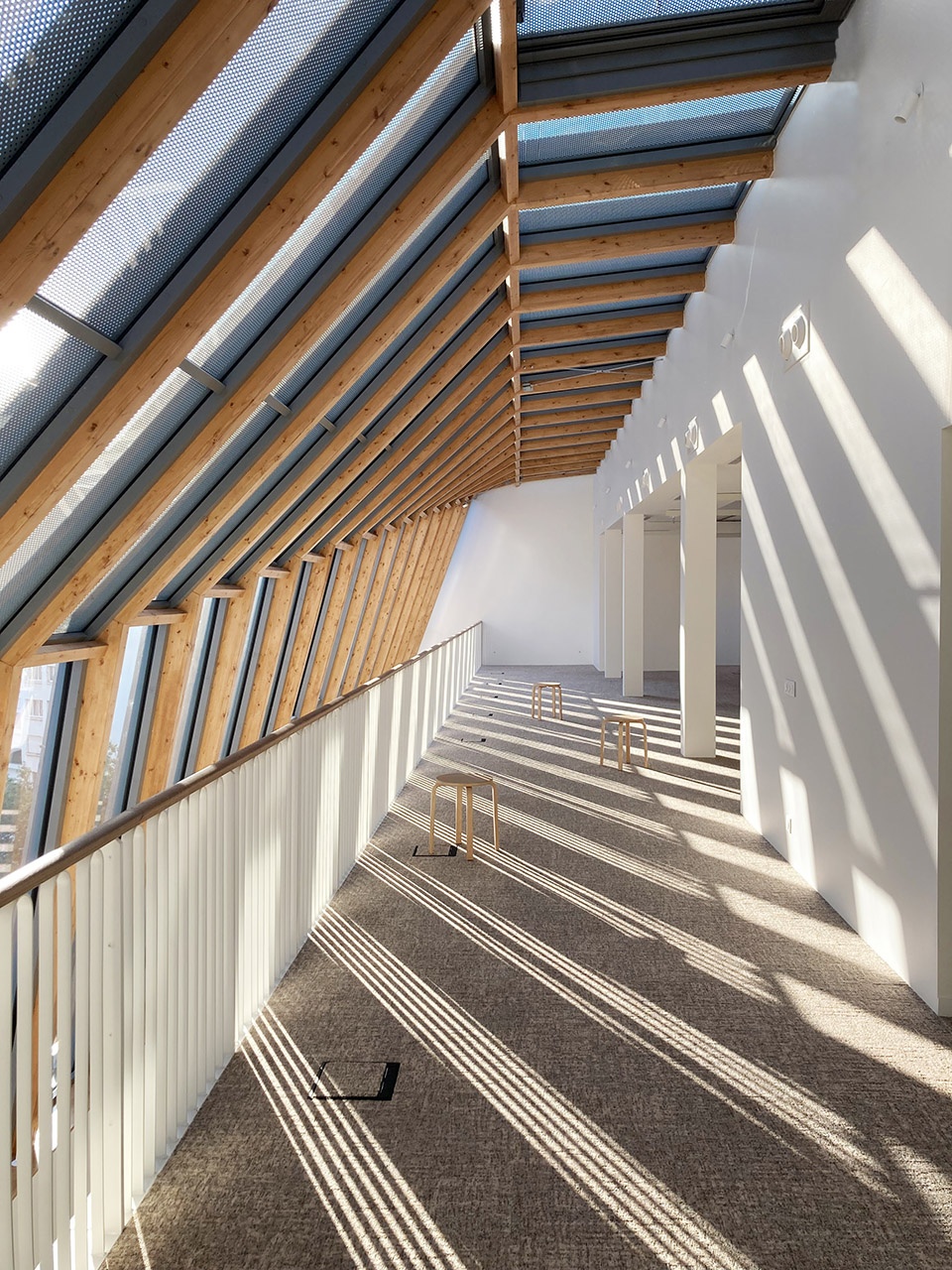 Nineteen glue-laminated timber elements form the three-sloped roof which defines the volume. The upper slope stays unchanged along the entire span of the roof, while the two lower slopes progressively alter in inclination. The framework is assembled in accordance to the Simonin Résix® method, and its prefabrication allowed to reduce the on-site construction time down to two days.