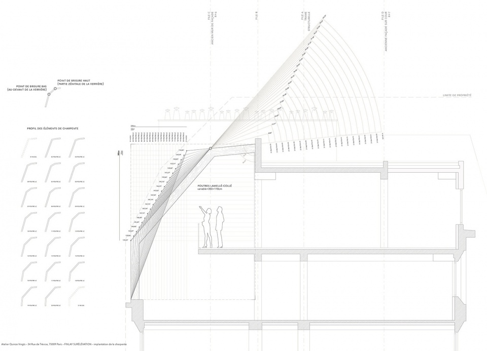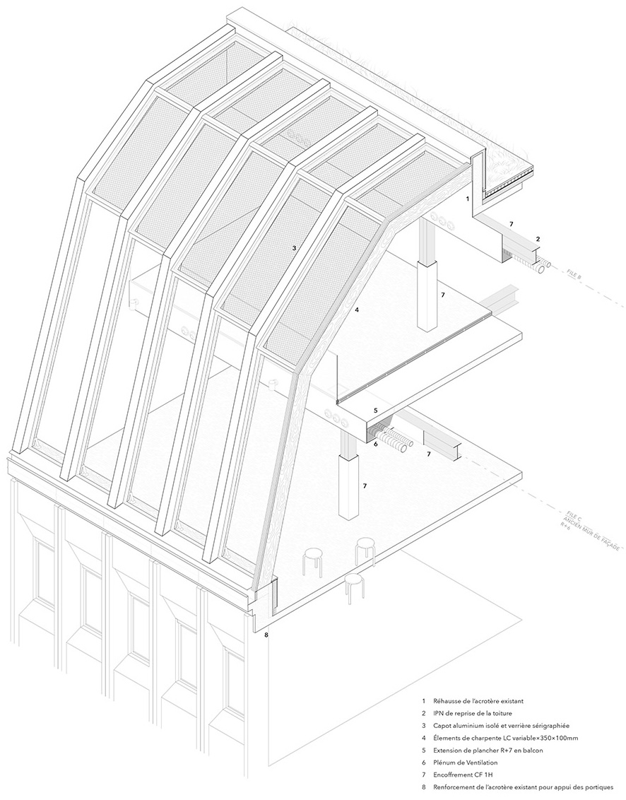 On Docteur Finlay street, a tripartite roof lifts up as the sun rises, and gradually twists so as to align with the neighboring roofs. Inserted in an empty space caught between two roof gables, the project defines itself as a wide glass structure, reinterpreting the traditional Parisian roof.