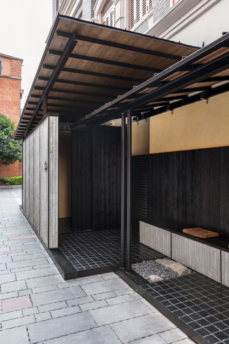 This project is an extension of the Japanese restaurant Golden Omakase in Shanghai, designed by atelier TUO. The extension was required to be completed within a short construction period, providing a small public space along the commercial street while adding a new entrance and private dining room for the restaurant.