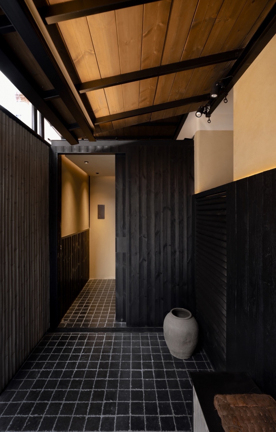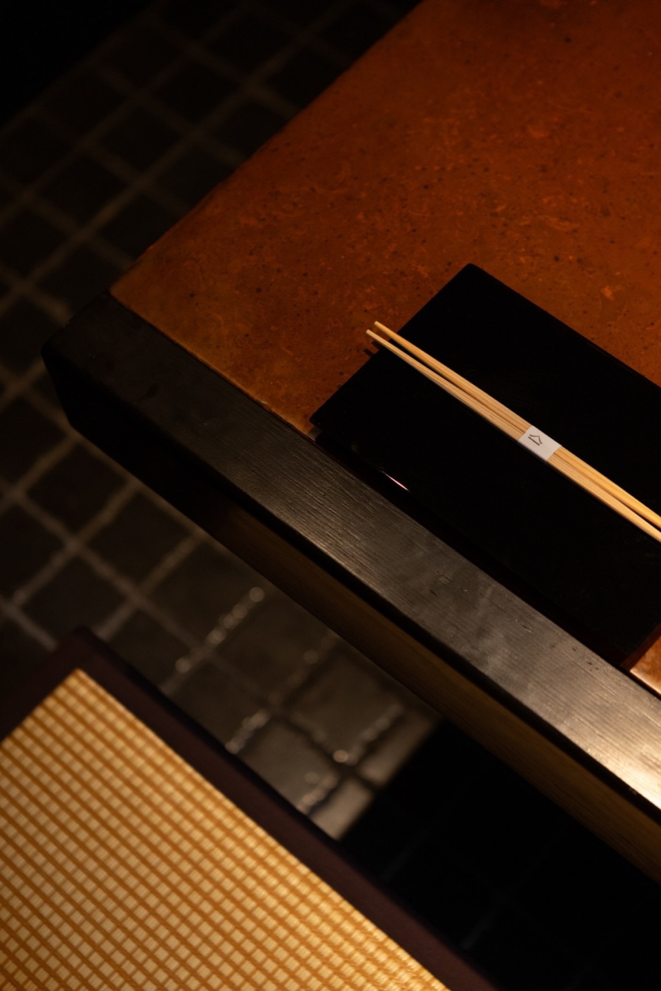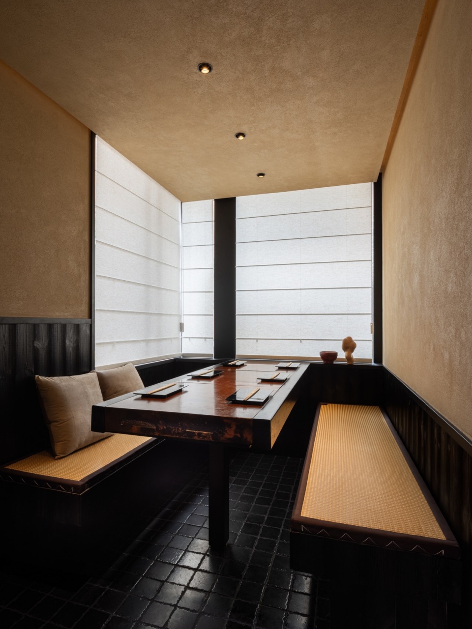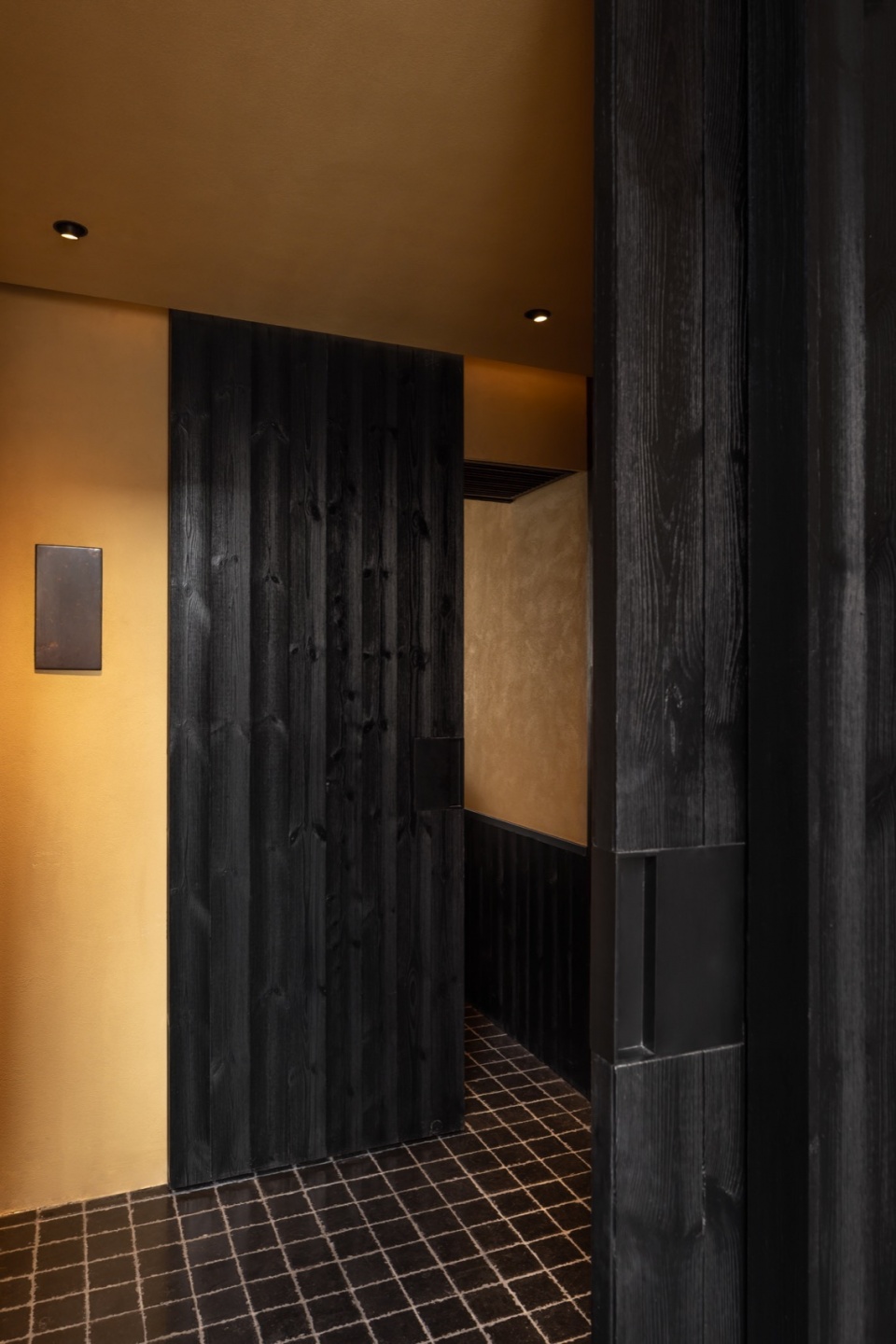 In the private room, the table is formed by three large Suzhou golden bricks, referencing the restaurant’s name “Golden.” The charred wood cladding is repurposed from the original restaurant facade, extending the memory of the original facade.