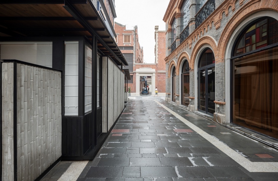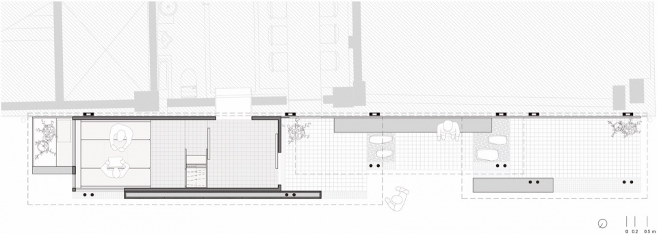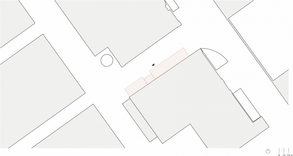 金 Omakase 位于上海一处具有商业与历史氛围的街区。为保留消防车通道,扩建场地呈细长形,约长 15 米、宽 2.1 米。人流集中来自场地一侧。