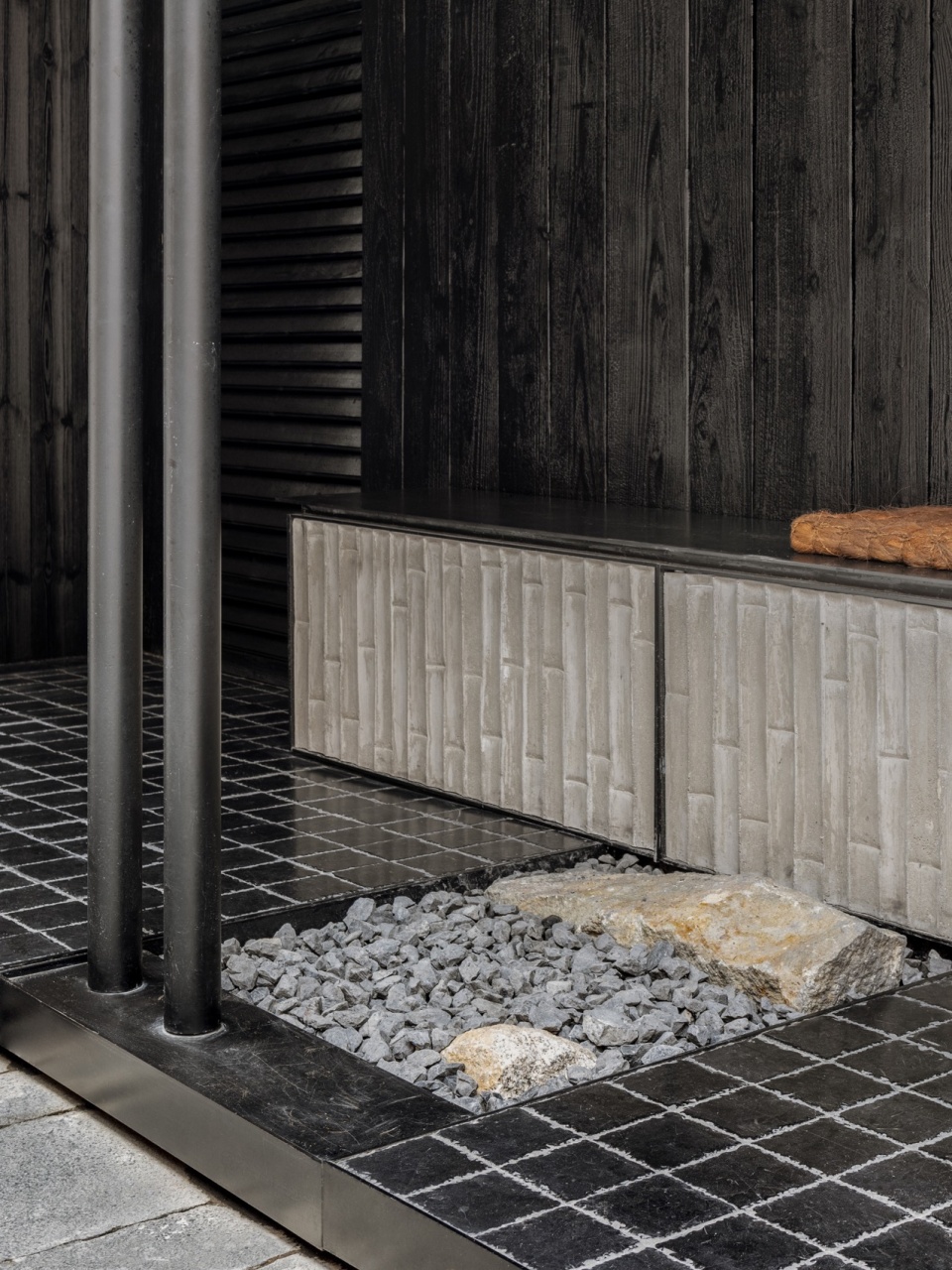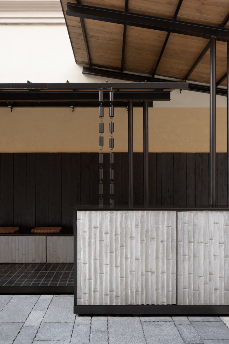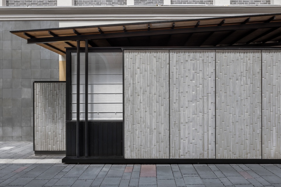 设计以平衡餐厅的私密性与街道空间的开放性为核心,并以快速施工为前提,从地面、墙体与屋顶三个层面展开。地面以材质变化划分为餐厅区、过渡区与公共区,碎石铺地形成边界;预制竹纹混凝土墙贯穿各区,将被分割的铺地重新整合为连续整体。三片铝镁锰屋面与对应的柱子形成独立结构系统,既提供遮蔽,又回应餐厅的LOGO。清晰的顶—地—墙关系界定了工厂预制与现场施工的边界,使快速搭建成为可能。