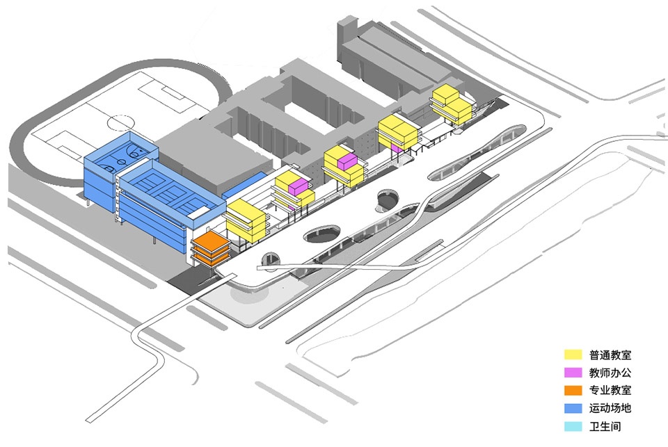 校园建筑不再以围墙划定界限,而以多层空间界面实现互动:上部为教学空间,中部为集散与交流空间,下部为运动与停车空间。建筑与地形共同构成城市绿廊的延伸,学生与家长、教师与市民在同一空间系统中交错使用,形成一种新的城市公共关系。