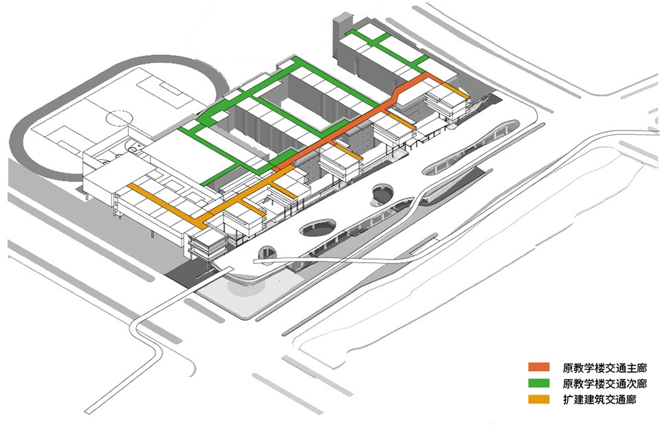 西侧扩建建筑跨越原有消防通道,保留通行功能的同时有效利用上部空间。北侧新增综合楼整合教学与活动功能,形成新的校园教学与活动中心。通过这种立体化布局,校园扩建在有限的用地中实现了垂直叠合:建筑跨越地面、绿地与消防通道,使教育空间与城市空间在竖向维度上建立新的联系。学生在悬挑教室中学习,视线穿越绿廊直达城市公园,校园与城市由此形成视觉与功能的双重延伸。