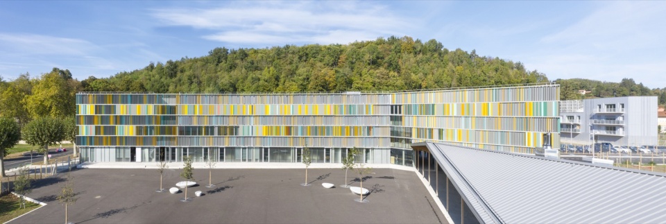 A third skin, formed by the sun breezes, connects the interior to its environment. Adjustable, these manage brightness and thermal comfort. Colored, they give the impression of a kinetic work of art that has taken place in front of the wooded hill. From now on, it is the users who give life to this moving picture, who moves, evolves, recomposes itself infinitely according to the seasons and uses.