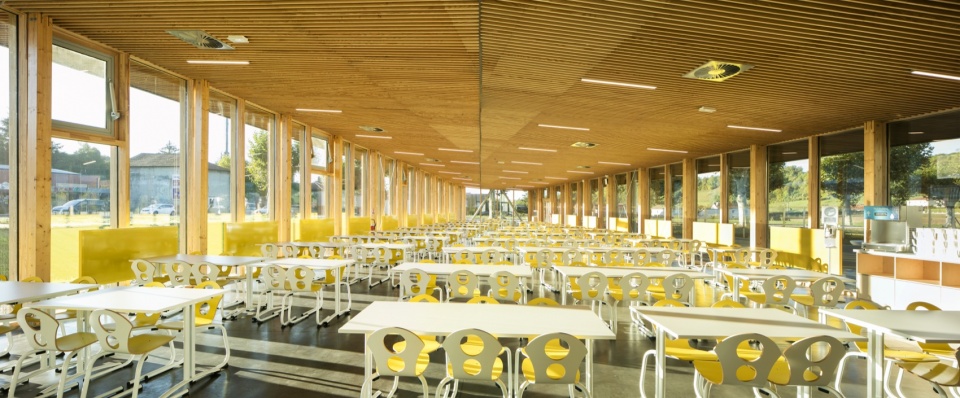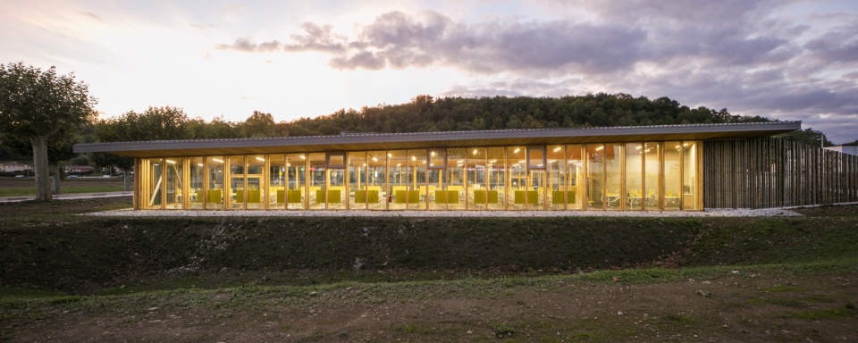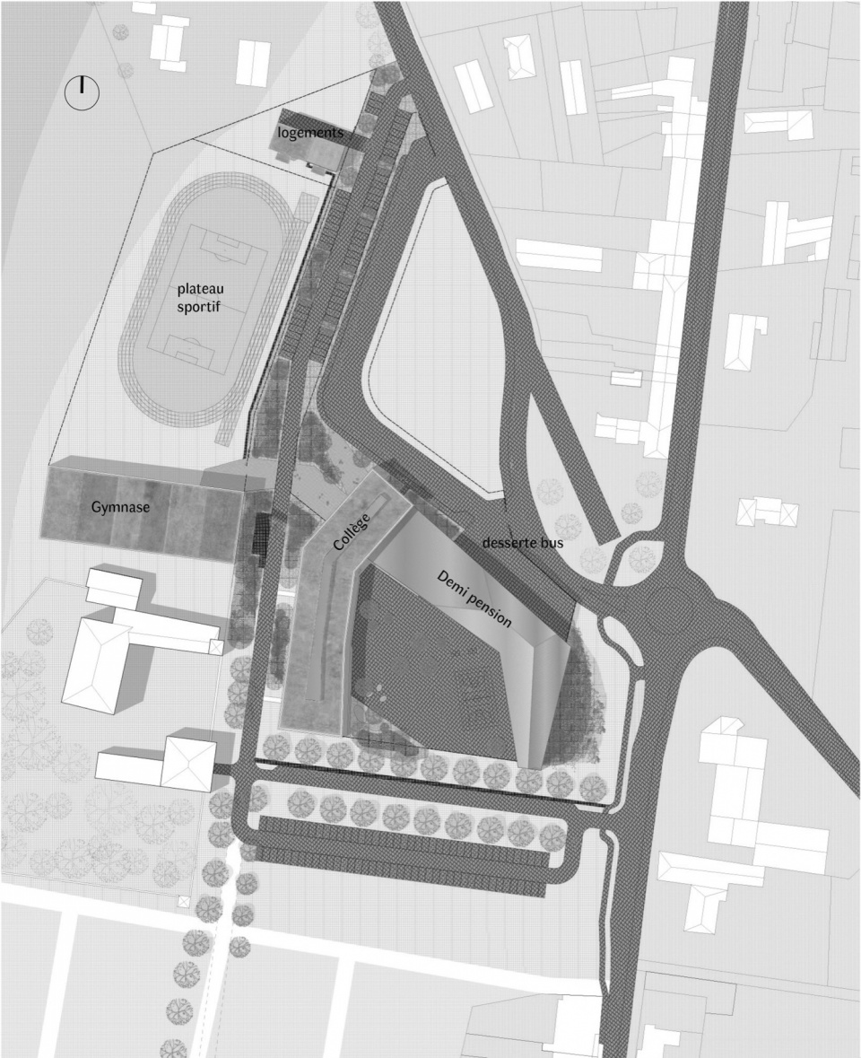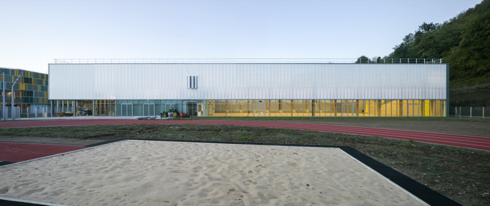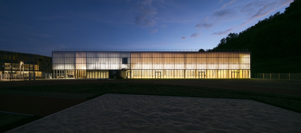Finally, a pedestrian walkway crosses the two entities of the program, the college on the one hand and the sports areas on the other hand. Thus, the college is not a closed island but a porous space, which opens onto the village. The canteen presents a largely glazed façade, open to the public space, providing a visual link with the village.