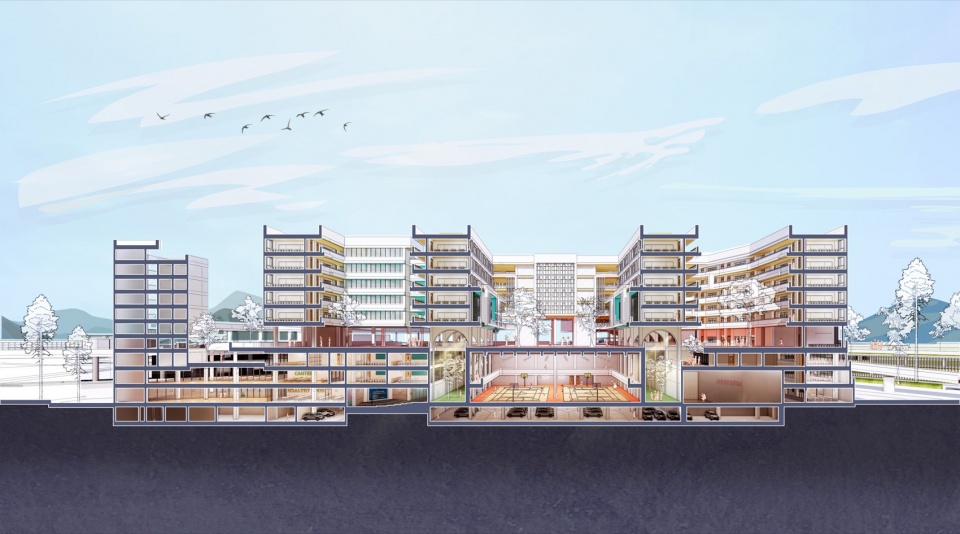 The base accommodates various public teaching spaces merged into a resource center, triggering a rich array of activity scenes. Its morphological treatment resembles a group of light clouds, constituting the first level.
