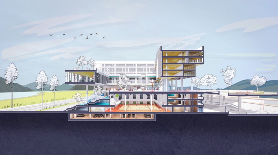 The design concept revolves around the “Learning Community in the Air,” presenting a vertical school with upper, middle, and lower spatial dimensions, fostering an open, composite, and vibrant campus environment.