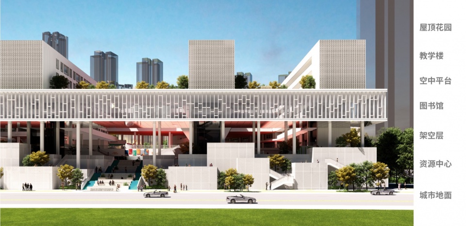 设计概念围绕“天空知城”展开,在垂直方向呈现上中下三个空间维度的立体学堂,催生开放、复合、充满活力的校园环境。