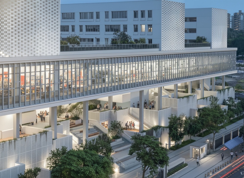 The development core of campus architecture aligns with the demands of quality education, with architecture increasingly emphasizing public and shared spaces. Despite vertical extension under high-density conditions, the integrity of space is preserved. Combined with horizontal functional integration, high density can instead create more shared, interactive, and participatory landscape venues.