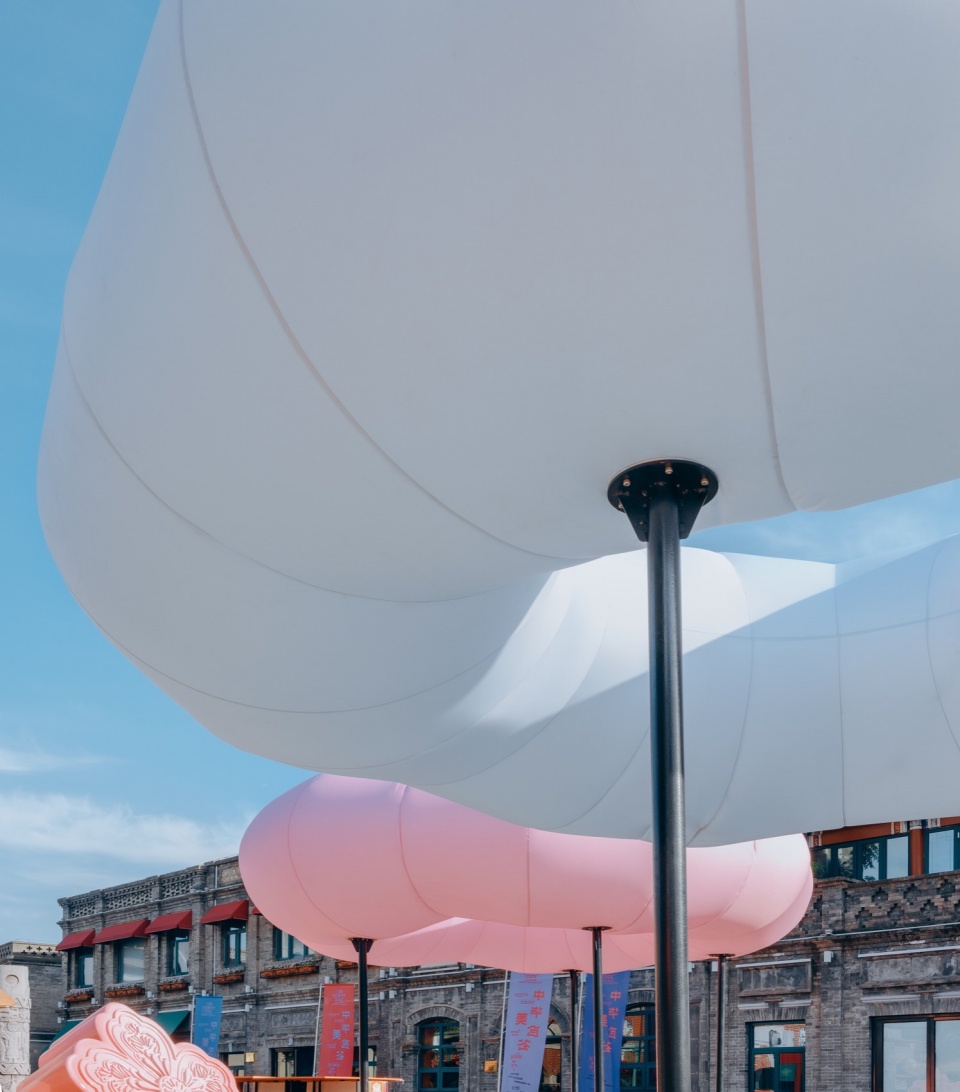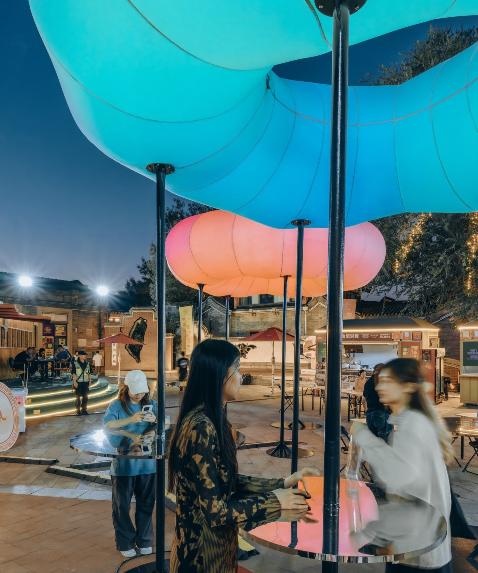 By day, the air membranes stretch like clouds, offering shade and shelter; by night, colorful lights flow, mimicking the oily sheen of Jiaoquan floating in the darkness, creating a poetic realm where taste and light intertwine.