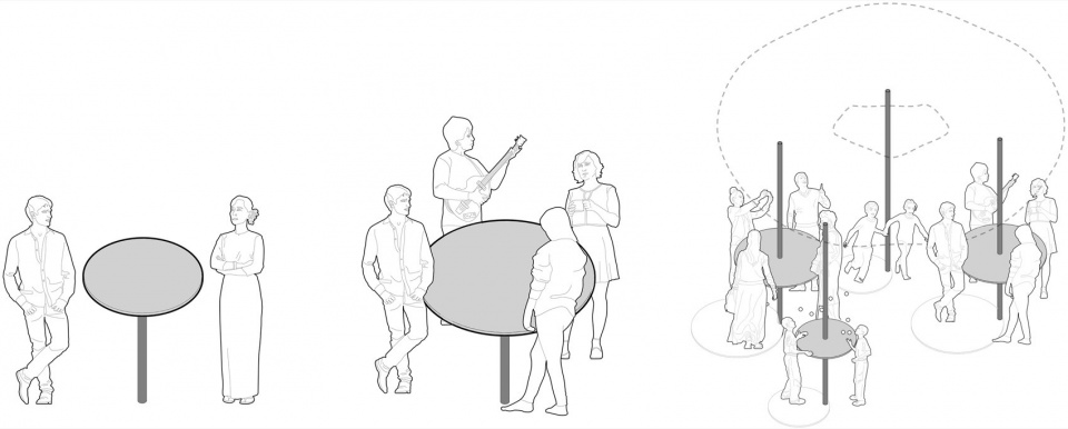 桌面以直径800mm与1200mm的尺度重现传统中式圆桌的”团聚”氛围——这也是最适宜于邻里互动的社交距离。镜面不锈钢材质将空中装置倒映于地面,形成虚实交织的视觉趣味。