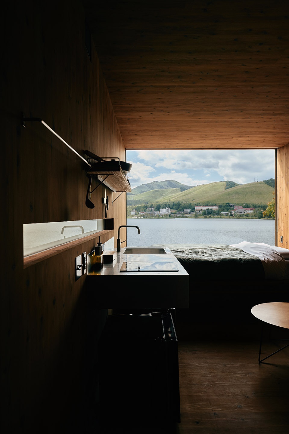 Inside, the atmosphere is calm and tactile. The main window frames the lake at its most scenic point, turning the interior experience into an extension of the outdoors. The layout remains simple: a place to cook, rest, and observe. The interior is designed to be an extension of the outdoor experience, light enters through multiple openings, shifting in tone throughout the day and reflecting the subtle changes in weather.