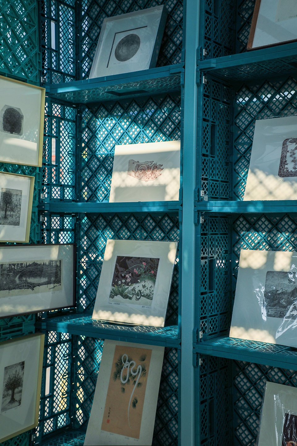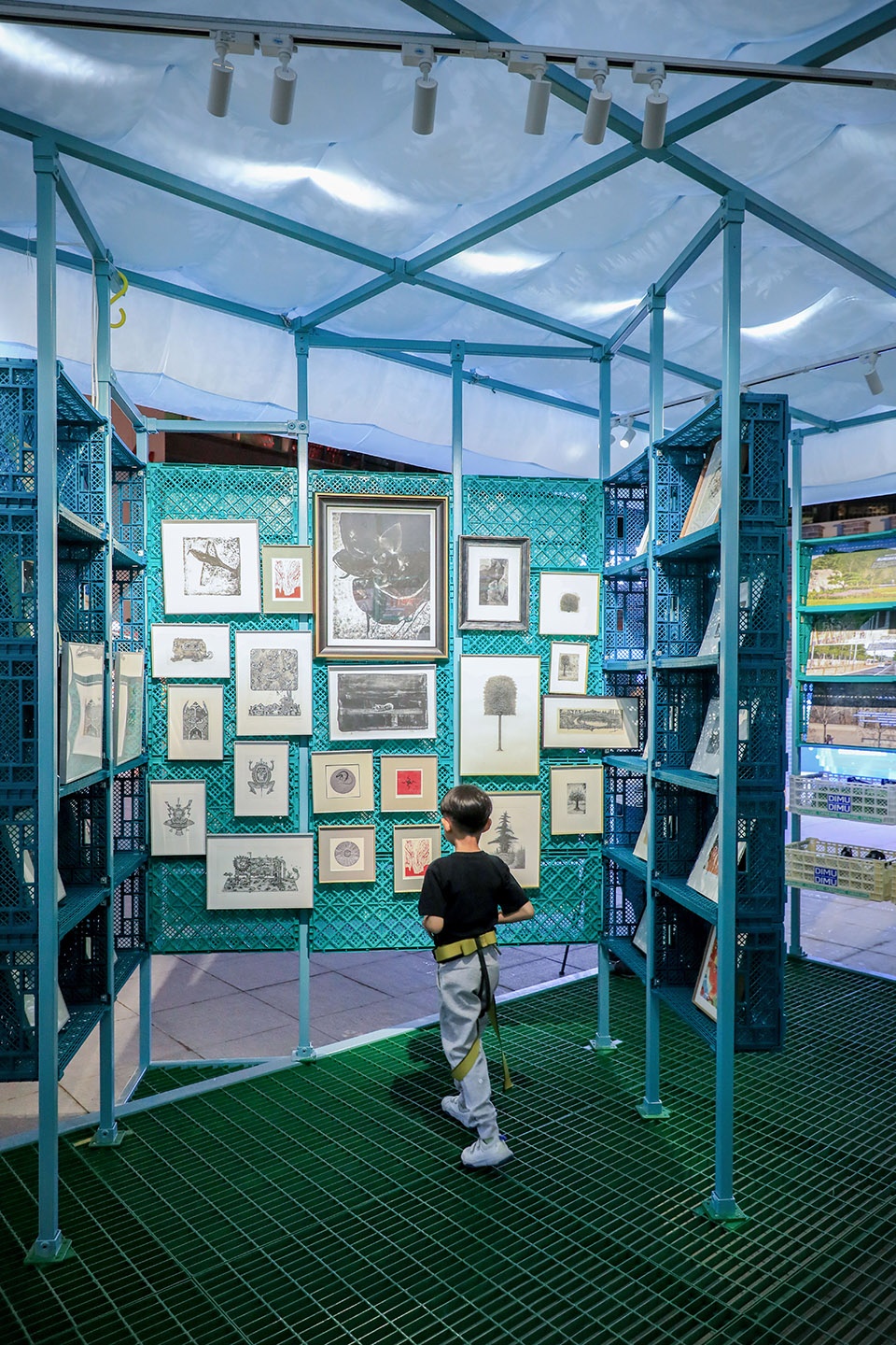 To enhance the artistic dimension, the exhibition includes print works by invited artists. Hung behind the plastic crates or placed inside them, the works create layered visual relationships with the structure, enriching the space and bringing contemporary aesthetics directly to visitors. This turns the exhibition into a walkable and engaging artistic setting.