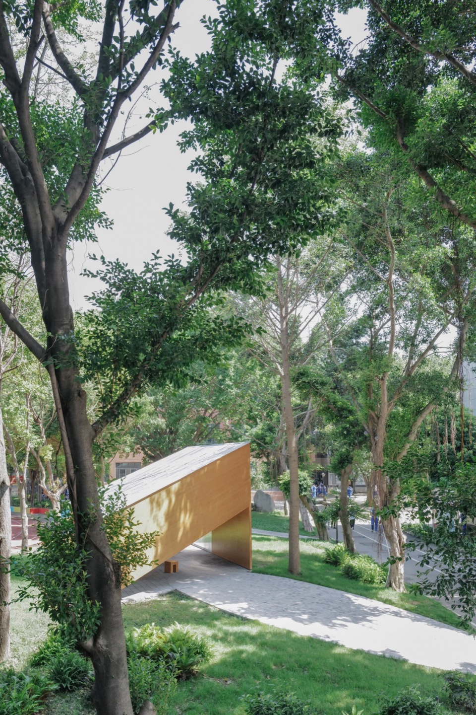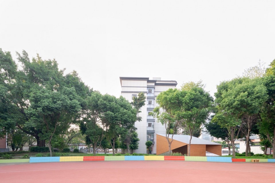 设计保留了南北贯穿的小径,将体量放置在场地南侧,与大榕树树荫提供的室外空间相呼应。平行四边形的平面回应了场地三百六十度可见的现状,朝向学校大门的一侧设置叶片形小广场,缓坡平衡高差,提供了徐徐展开的步入感。朝着操场倾斜的屋顶唤起人们记忆之初对家和栖身之所的想象,向下延伸出四个简单的平面,围合出通透的半室外空间;三个朝向分别框景操场榕树与校园入口的景观,墙体与周边正交的道路之间成斜角,移步换景之间,洞口忽而重叠忽而远离,让日常风景多了一层趣味。