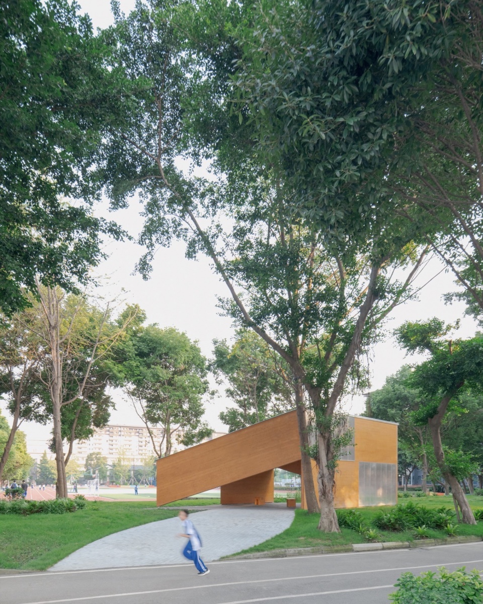 该项目位于四川省成都市武侯区一所十二年一贯制民办学校内,作为25周年校庆校园环境更新的一部分。场地位于临近校门的一块景观绿化带内,坐落于操场、教学楼、行政楼与食堂流线十字交叉的位置,场地现状是典型的传统绿化格局,边界围有一圈常绿乔木,现有一条南北走向的踏步石小路作为教学楼主入口与宿舍之间的便捷通道。校方希望在整体提升该绿地的基础上,设计一处接待新生家长介绍概况的景观构筑物,并为师生课余提供多样的活动和休憩空间。作为一所涵盖不同年龄层学生的学校,校方希望构筑物体现办学教学的多样性,适应季节性如招生和节庆活动,以及日常性如课余休闲和室外研讨的需求,且作为临近校园主入口的形象建设,成为学校展示校园整体环境与特色的名片。