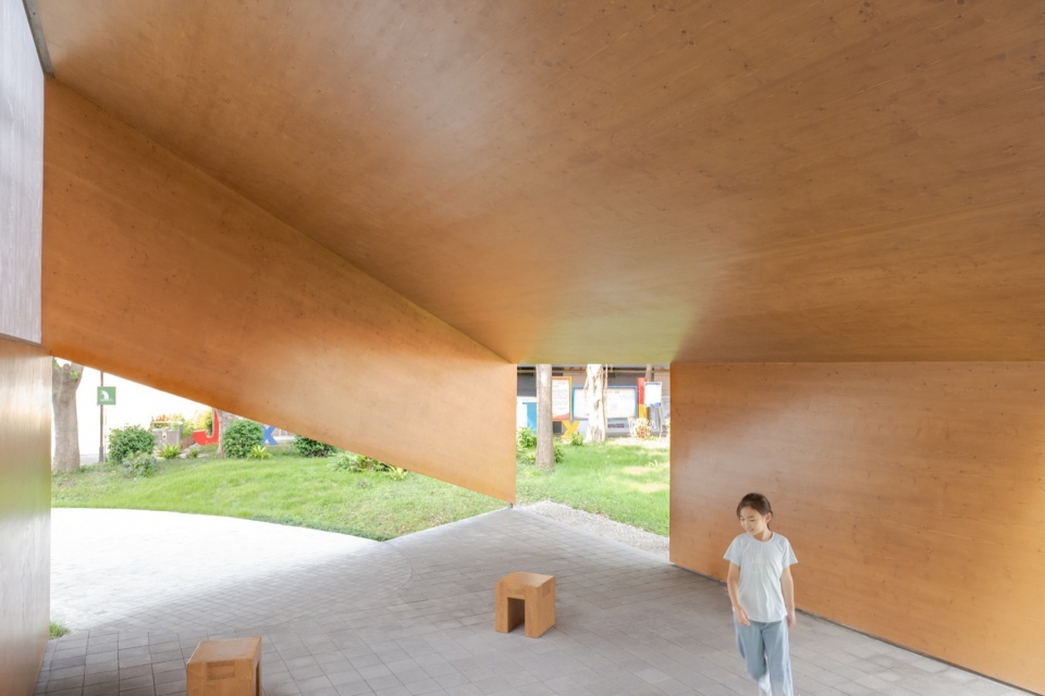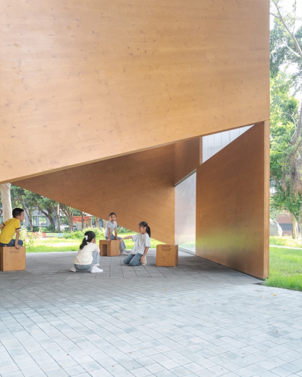 With the anniversary celebration approaching, to minimise disruption to teaching activities, construction was restricted to non-working days. Cross-Laminated Timber (CLT) was selected for its structural strength and rapid assembly. Roof and wall components were prefabricated off-site and installed on-site via crane within three non-working days. The roof combines corrugated aluminum and polycarbonate panels; a triangular aperture is cut into the underlying CLT roof panel to let additional daylight into the interior. For economy of material, offcuts from the CLT panels were used to create a series of stools.