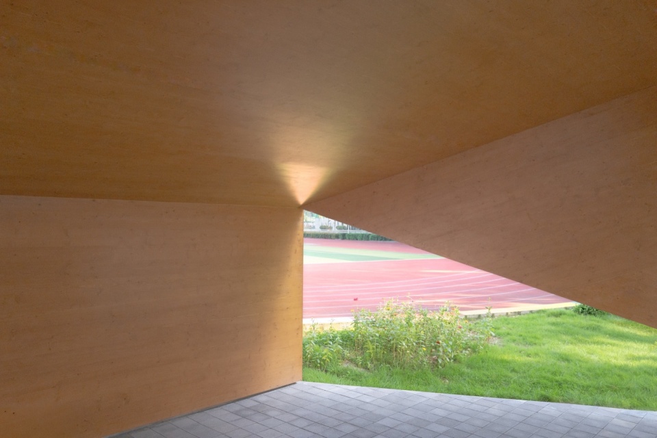 由于校庆在即,工期紧张,且为了不影响学校正常教学,校方要求建筑物的施工在非工作日进行。设计选用正交胶合板CLT材料,结构强度高,安装便利。屋顶与墙体在木结构加工厂预制,运送到场地通过吊车在三个非工作日内完成安装。面对教学楼一侧采用阳光板降低视觉影响,同时成为操场景观的滤镜。屋面采用铝制波浪板和聚酯波纹板的拼接,内侧留有一个三角开孔将天光引入室内。