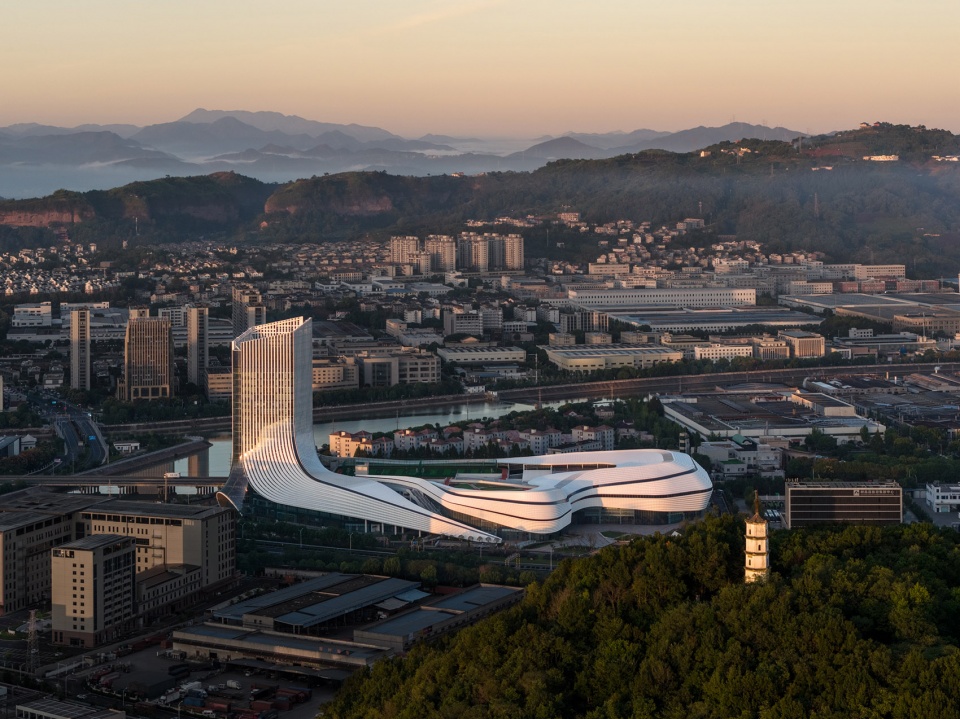 Creating a distinctive, iconic image for the large complex was crucial. Inspiration was drawn from Xinchang’s unique landscape culture. Historically significant as a stop on the “Tang Poetry Road of Eastern Zhejiang,” the region is celebrated for its peaks and waterfalls. The design uses the fluidity of water and the contours of mountains as its formal motif, employing continuous massing and a horizontal rhythm to define the city boundary and create a waterfront interface that is both culturally expressive and contemporary.