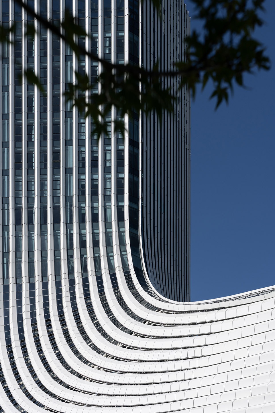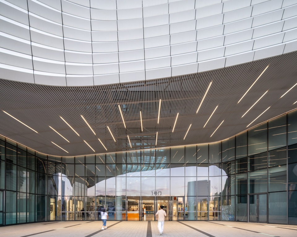 The hotel tower marks a new high point on the north bank skyline. The tower’s atrium suggests a cascading waterfall, forming a sculptural volume through dramatic transitions. The curtain wall, featuring perforated aluminum panels and metal rod grilles, provides dynamic light effects during the day and a distinct illuminated landmark at night.