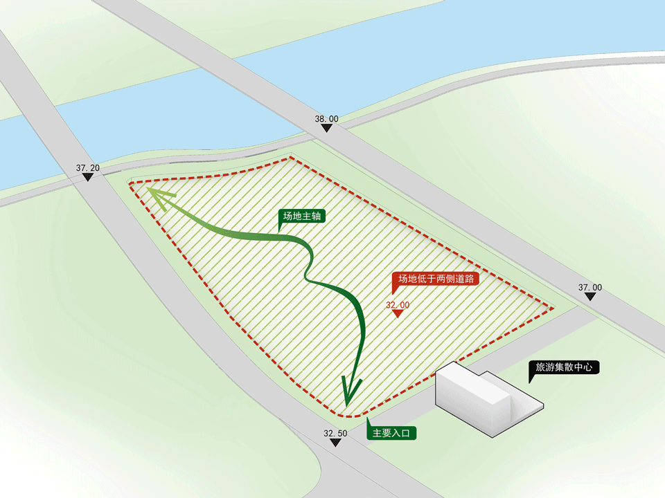场地北侧紧邻游客中心与客运中心,是人流的主要汇入方向。因而,主馆、训练馆与集散广场等主力业态布置于北侧,便于承接赛事与公众活动;而对私密性与舒适度要求更高的运动员酒店则安置于南侧,面向江景,形成静谧宜人的休憩界面。
